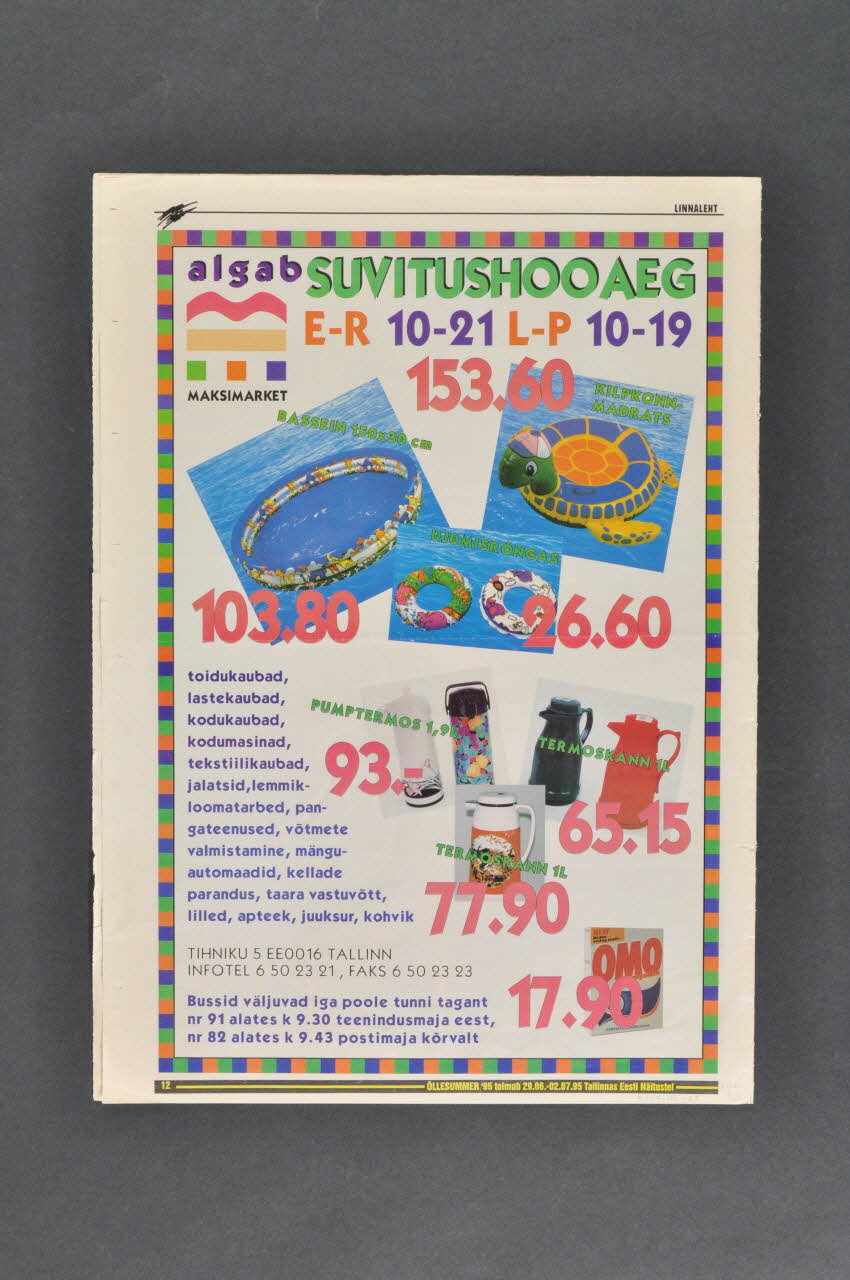Sur la dernière page, fond blanc avec des images de piscines, de bouées pour enfant, de thermos et de paquet de lessive avec des prix inscrits en rose et encadrées de lignes de carrés bleus, oranges et verts.