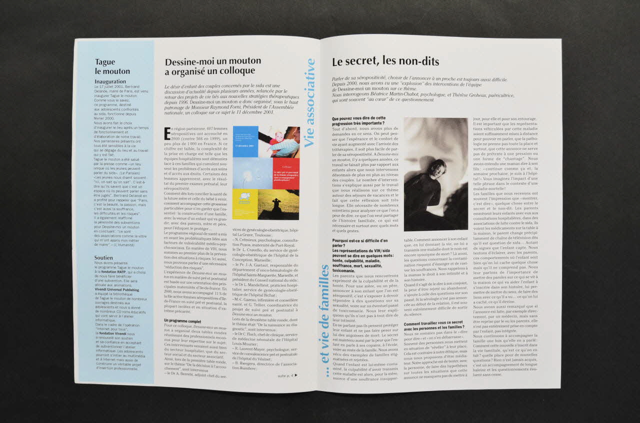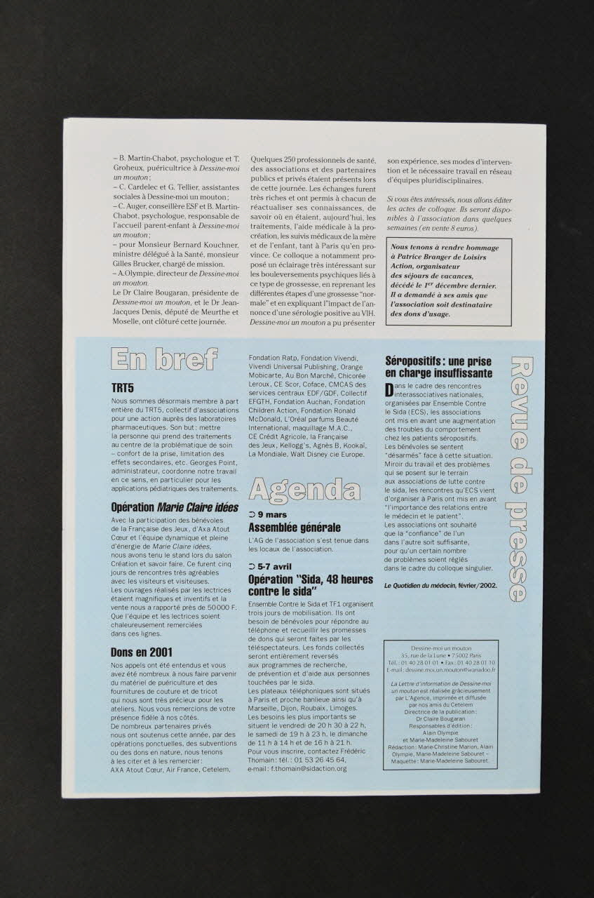 1ère page A gauche : Editorial de Dr Claire Bougaran présidente (nouvelle lettre tant attendue, nouveau logo, bleu synonyme de nouvelle énergie, bilan) A droite : La parole à Jérôme Pouleteau , Cegetel , Portes ouvertes pour une rencontre (partenariat pour Tague le Mouton) Page 2 Vie associative (en bleu verticalement) : Tague le mouton (inauguration, avec Delanoë, soutiens) / Dessine-moi un mouton a organisé un colloque (colloque sur le suivi pré et postnatal de la femme séropositive) Page 3 "... et vie des familles (en bleu verticalement ) : "Le secret , les non dits (difficultés de parler de sa séropositivité, culpabilité des parents, rôle de Dessine-moi un mouton) Page 4 En Bref , Agenda Bon de soutien Coordonnées de l'association.