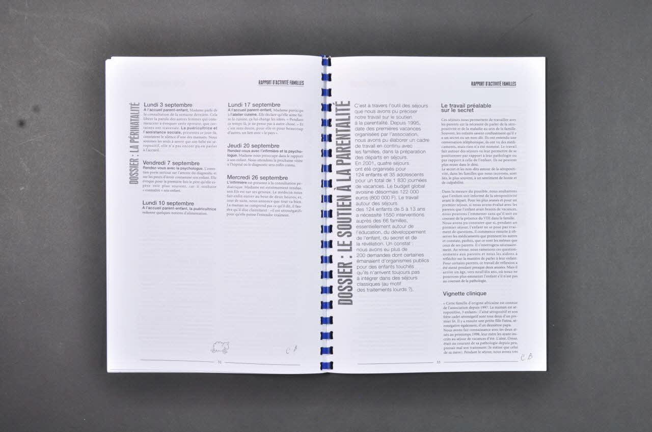 p. 3 Rapport moral : Discours de Mme le Dr Claire Bougaran, présidente p. 5 2001 en chiffre (familles suivies, adolescents, vie associative) p. 6 Dessine-moi un mouton pratique (coordonnées, membres du conseil, permanants, bénévoles...) p. 8 Rapport d'activité Familles - Les chiffres 2001 Analyse et constats : "Pour la première fois depuis l'origine de l'association, 2001 marquera la baisse du nombre des familles suivies, soit 205 familles contre 220 en 2000. Toutefois, le nombre d'interventions auprès des familles et du réseau a, lui, fortement augmenté de 4 658 à 5 092" (...) Qui sont ces 205 familles? (...) Les départements de localisation (...) Commentaires sur les données sociales (...) - Nos principes d'action et d'intervention "Ce que nous essayons d'être pour la famille, c'est une permanence au milieu de tant d'interlocuteurs du quotidien. le lien, c'est l'enfant et son devenir" (...) Un cadre de travail et d'écoute (...) Nos moyens (...)Les champs d'action : L'insertion; l'économie sociale et familiale; la protection parentale et infantile; les relations familiales; la qualité de vie; le soutien du suivi médical. (...) Les moyens. - Planning d'une semaine à "Dessine-moi un mouton" - Dossier : La périnatalité "En 2001, 45 familles ont été suivies dans le cadre du soutien périnatal. Si ces familles ne représentent que moins de 22 % du total des familles, elles ont mobilisé l'ensemble des professionnels de l'équipe pour presque la moitié des interventions (2513 sur 5091) et à hauteur de plus de 59% du temps. L'accueil parent-enfant leur est désormais réservé les lundis et jeudis après-midi. Un constat : la progression régulière, depuis l'arrivée des trithérapies en 1995, du nombre de femmes séropositives arrivant au terme de leur grossesse. 607 femmes séropositives ont accouché en Ile-de-France en 2000. la plupart de ces femmes sont isolées et dans une précarité sociale qui nécessite un suivi rendu encore plus complexe par le contexte psychologique. Le 11 décembre 2001, nus avons organisé un colloque réunissant 25O spécialistes français sur "le suivi pré et postnatal de la femme séropositive, quel accompagnement pluridisciplinaire?" pour échanger et réfléchir sur nos pratiques, compte tenu du peu de réponses existantes. Notre action consiste à assurer le lien entre tous les intervenants, médicaux et sociaux voire associatifs. (nombreux exemples tirés du vécu de la pratique) (...) Dossier : Le soutien à la parentalité "C'est à travers l'outil des séjours que nous avons pu préciser notre travail sur le soutien à la parentalité. depuis 1995, date des premières vacances organisées par l'association, nous avons pu élaborer un cadre de travail en continu avec les familles, dans la préparation des départs en séjours. En 2001, quatre séjours ont été organisés pour 124 enfants et 35 adolescents pour un total de 1 830 journées de vacances. le budget global avoisine désormais 122 000 euros (800 000 francs). Le travail autour des séjours des 124 enfants de 5 à 13 ans a nécessité 155à interventions auprès des 66 familles, essentiellement autour de l'éducation, du développement de l'enfant, du secret et de la révélation. Un constat : nous avons eu plus de 200 demandes dont certaines émanaient d'organismes publics pour des enfants touchés qu'ils n'arrivent toujours pas à intégrer dans des séjours classiques (au motif des traitements lourds?) (nombreux exemples tirés du vécu de la pratique) (...) p. 38 Rapport d'activité adolescents Programme : "Tague le mouton" "Tague le mouton a pour vocation d'être un pôle d'échange, un espace d'information et de questionnement pour les adolescents et désormais pour les jeunes adultes touchés ou concernés par le VIH/SIDA. Il propose écoute et réflexion sans toutefois l'imposer, c'est à dire en reconnaissant les résistances des jeunes et en les respectant. Mais le fait même de fréquenter un lieu spécifique dissout en quelque sorte une partie du silence qui entoure encore trop souvent le VIH/SIDA." (...) Inauguré par Bertrand Delanoë, maire de Paris, en juillet 2001 Les perspectives 2002 Agenda 2001 Rapport financier Collecte de fonds et partenariats privés 1 Ressources privées : principalement Kellog's, MATMUT, Parfums Beauté International et (pour Tague) Vivendi, RATP, Agnès B) Partenaires associatifs : principalement ECS et Solidarité Sida 2 Laboratoires : Boehringer et Pfizer (colooque) 3. ventes d'objets et agendas (entreprises) 4 Financement des vacances : fondation suisse Children Action et Orange Mobicarte 5. Agenda (recettes publicitaires, carte de visite pour l'association) 6 partenariats en nature : Axa et Atout coeur (rapports annuels, appels à dons, invitations, papier à lettre); CE du CETELEM (La lettre); l'Agence (supports de communication) La Française des jeux (book vacances des enfants) La mondiale (cartes de voeux) Accord Valmy (photogravure), Imprimerie Karcher (Affiches) Collectes de vêtements et articles de puériculture. Bénévoles d'entreprises La Française des Jeux, AXA Atout coeur, le CETELEM et Mondiale Entraide Budget prévisionnel 2002 Partenaires en 2001