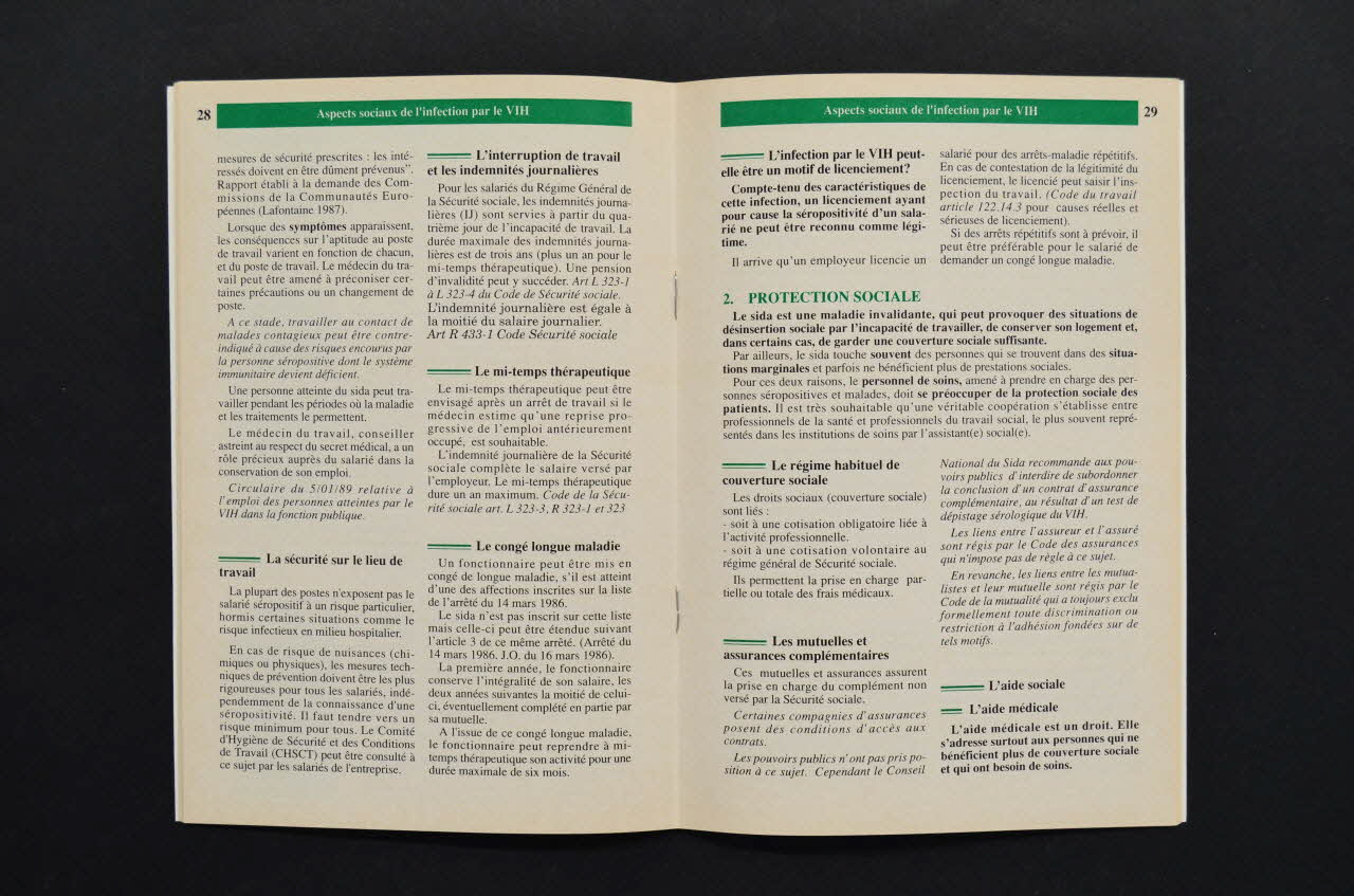 I. Les nouveaux enjeux du sida // // 1. Pourquoi s'informer sur le sida ? // // 2. L'épidémie dans le monde // Quelle est la réalité actuelle de l'épidémie ? // L'épidémie de sida est-elle enrayée ? // Pourquoi cette épidémie est-elle si grave ? // L'épidémie est-elle la même partout ? // // 3. La lutte contre l'épidémie // La prévention // Les moyens de la prévention // Le dépistage volontaire et individuel // La prise en charge // Le rôle des associations // // 4. Questions d'éthique // Le dépistage doit-il être systématique et obligatoire ? // Faut-il isoler les séropositifs et les malades ? // La séropositivité doit-elle être déclarée ? // Quelles sont les positions des politiques et des religieux ? // // 5. Les enjeux du sida // // II. L'infection par le VIH // // 1. Définitions // L'infection par le VIH // Le sida // Les virus responsables du sida // // 2. Modes de contamination et moyens de prévention // Comment se transmet le VIH ? // Transmission par les relations sexuelles // Transmission par le sang // Transmission mère-enfant // Dans la vie quotidienne // Les voyages // Y a-t-il des "groupes à risque" // // 3. De la contamination à la séropositivité // Que se passe-t-il dans l'organisme après une contamination par le VIH ? // Les tests de dépistage // Y a-t-il des symptômes de la contamination ? // A partir de quel moment une personne contaminée peut-elle transmettre le virus ? // Toutes les personnes contaminées par le VIH deviennent-elles malades du sida ? // // 4. De la séropositivité aux premiers symptômes // Que se passe-t-il dans l'organisme lors de l'apparition des anticorps anti-VIH ? // Y a-t-il des symptômes de la séropositivité ? // Comment surveille-t-on l'état des défenses immunitaires ? // Quels traitements propose-t-on aux séropositifs ? // Y a-t-il des facteurs qui peuvent accélérer l'évolution de l'infection ? // // 5. Les formes mineures et intermédiaires de la maladie // Que se passe-t-il dans l'organisme lors de l'apparition des premiers signes de la maladie ? // Les examens de laboratoire // Les symptômes // Les traitements // Y a-t-il des signes qui permettent de prévoir une évolution rapide vers le sida ? // // 6. La forme majeure : le sida // Que se passe-t-il dans l'organisme lors du passage au sida ? // Les infections secondaires et opportunistes // Les cancers secondaires // Les atteintes du système nerveux // Les traitements // Le sida, une maladie chronique ? // // III. Aspects sociaux de l'infection par le VIH // // 1. Droit du travail et infection par le VIH // L'embauche // Les visites médicales // Les personnes séropositives peuvent-elles continuer à travailler ? // La sécurité sur le lieu de travail // L'interruption de travail et les indemnités journalières // Le mi-temps thérapeutique // Le congé longue maladie // L'infection par le VIH peut-elle être un motif de licenciement ? // // 2. Protection sociale // Le régime habituel de couverture sociale // Les mutuelles et assurances complémentaires // L'aide sociale : // - L'aide médicale // - Le RMI // - L'allocation "adulte handicapé" // Le sida, "affection longue durée" // L'indemnité versée aux hémophiles contaminés par le VIH // Les centres de santé gratuits // // 3. Coût de l'infection par le VIH // Pourquoi s'informer sur les coûts de la santé ? // Les dépenses de santé // Le coût de la séropositivité / // - Coût d'un dépistage // - Coût annuel du suivi d'une personne séropositive // Le coût annuel de l'hospitalisation // La durée moyenne de séjour à l'hôpital // // IV. Structures de soins et infection par le VIH // // 1. La circulation de l'information à l'hôpital // Secret professionnel et secret médical // Le respect du secret professionnel // L'information // La vérité // Les risques d'indiscrétion // // 2. La prise en charge du patient et de son entourage // L'accueil et l'accompagnement // Y a-t-il des aspects psychologiqus spécifiques ? // Le soutien psychologique // L'accompagnement social // La prise en charge globale // L'orientation : // - L'hôpital de jour // - L'hospitalisation à domicile // - Les maisons de post-cure // - Les appartements thérapeutiques // // 3. La prévention de la contamination // Quels sont les moyens d'inactivation du VIH ? // Quelles précautions doivent prendre les personnes qui ne sont pas en contact avec des liquides biologiques ? // - Cas particulier de l'hôtellerie // - Cas particulier de la maintenance technique // Quelles précautions prendre lors de contacts avec des liquides biologiques dans les situations de soins ? // - Précautions générales pour se protéger, pour inactiver le virus // - Particularités de certains soins : soins de bien être et de confort, soins en obstétrique , soins kinésithérapiques, soins dentaires, soins mortuaires // - Manipulation des produits biologiques (P. 1-4), à l'intérieurLogo