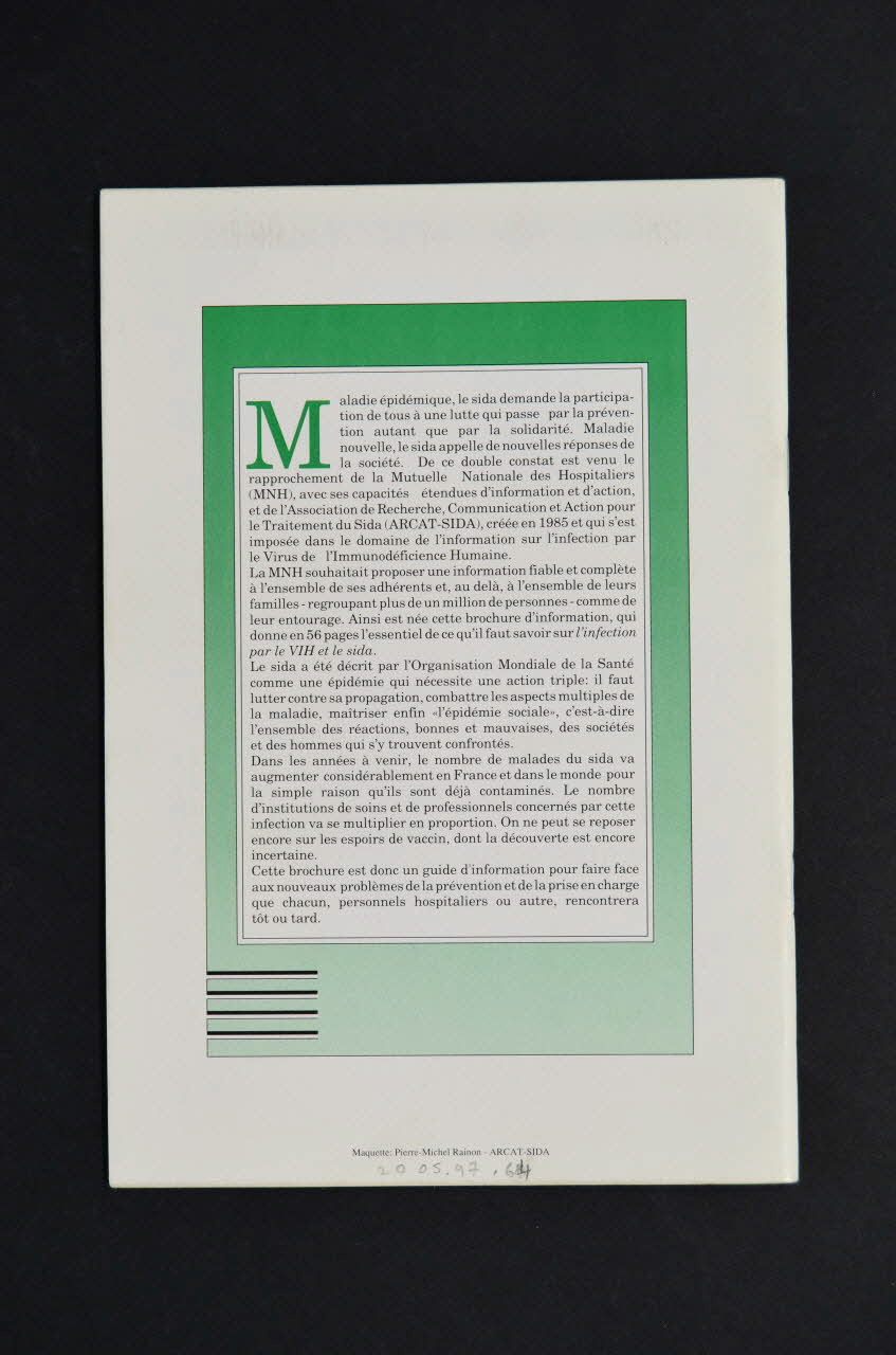 Infection par le VIH // et // Sida // // Pratiques professionnelles // Connaissances médicales // Prévention // Vie quotidienne // Enjeux sociaux // // Supplément au numéro 87 de "Notre Revue", publication trimestrielle de la Mutuelle Nationale des Hospitaliers, sur la couvertureSommaire