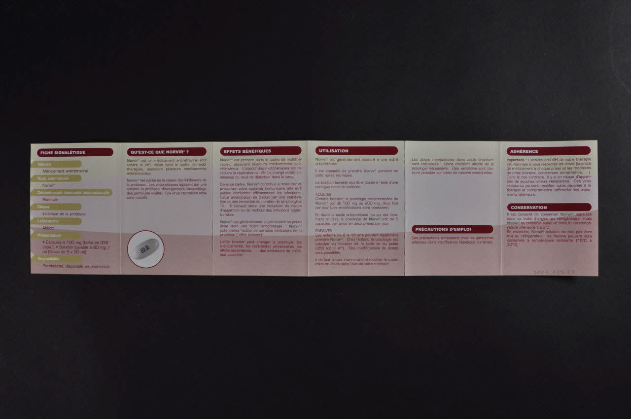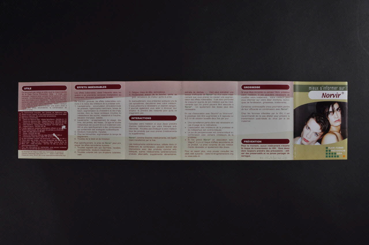 Mieux s'informer sur Norvir (Titre du dépliant imprimé sur la couverture.)Fiche signalétique // Qu'est-ce que Norvir ? // Effets bénéfiques // Utilisation // Précautions d'emploi // Adhérence // Conservation // Effets indésirables // Interactions médicamenteuses // Grossesse // Prévention // Utile (Titres des rubriques présentes dans le dépliant.)PLATE-FORME // PREVENTION // SIDA (Nom de l'association imprimé en bas à droite de la couverture.)Décor