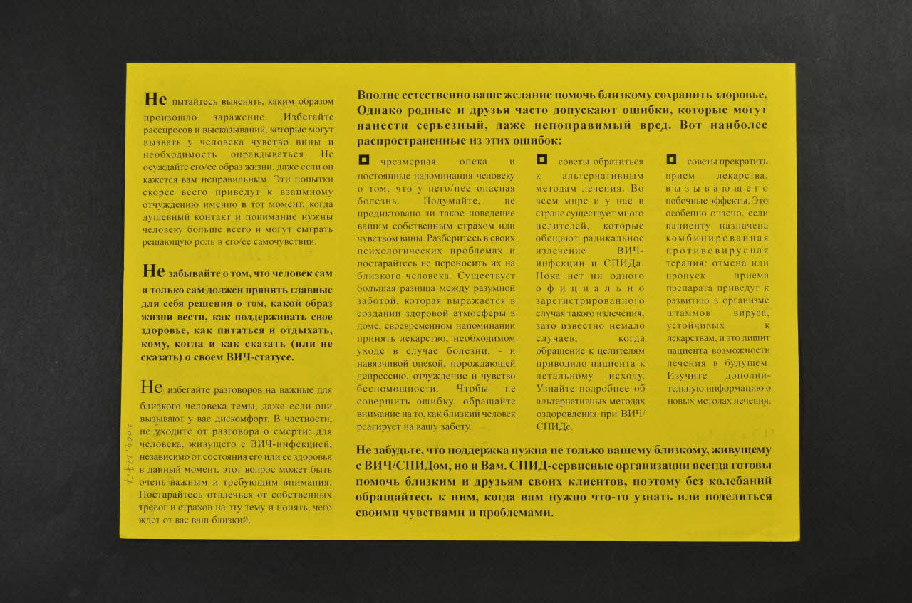 Il s'agit d'une photocopie recto-verso au format A4 sur du papier machine jaune d'un dépliant dont le texte est imprimé en noir. Il est en alphabet cyrillique.