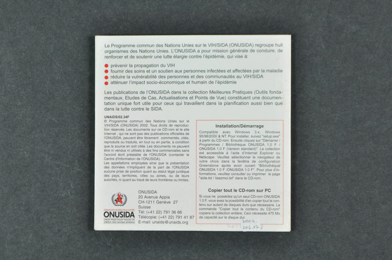 Bibliothèque des documents de l'ONUSIDA (du CDrom et au centre du recto de la pochette), en hautTexte