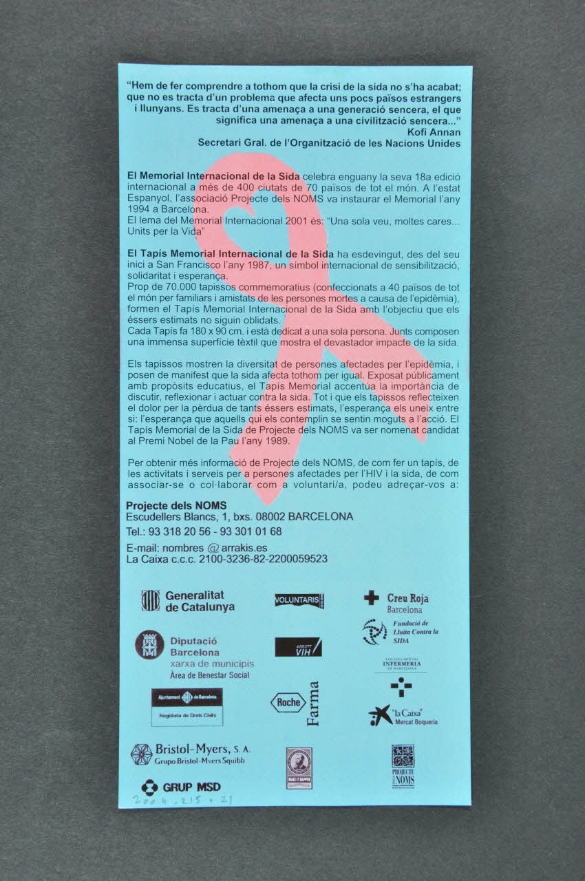 8è memorial internacional de la sida // Barcelona 2001 // Projecte dels Noms (inscription en noir en haut), rectoLogo
