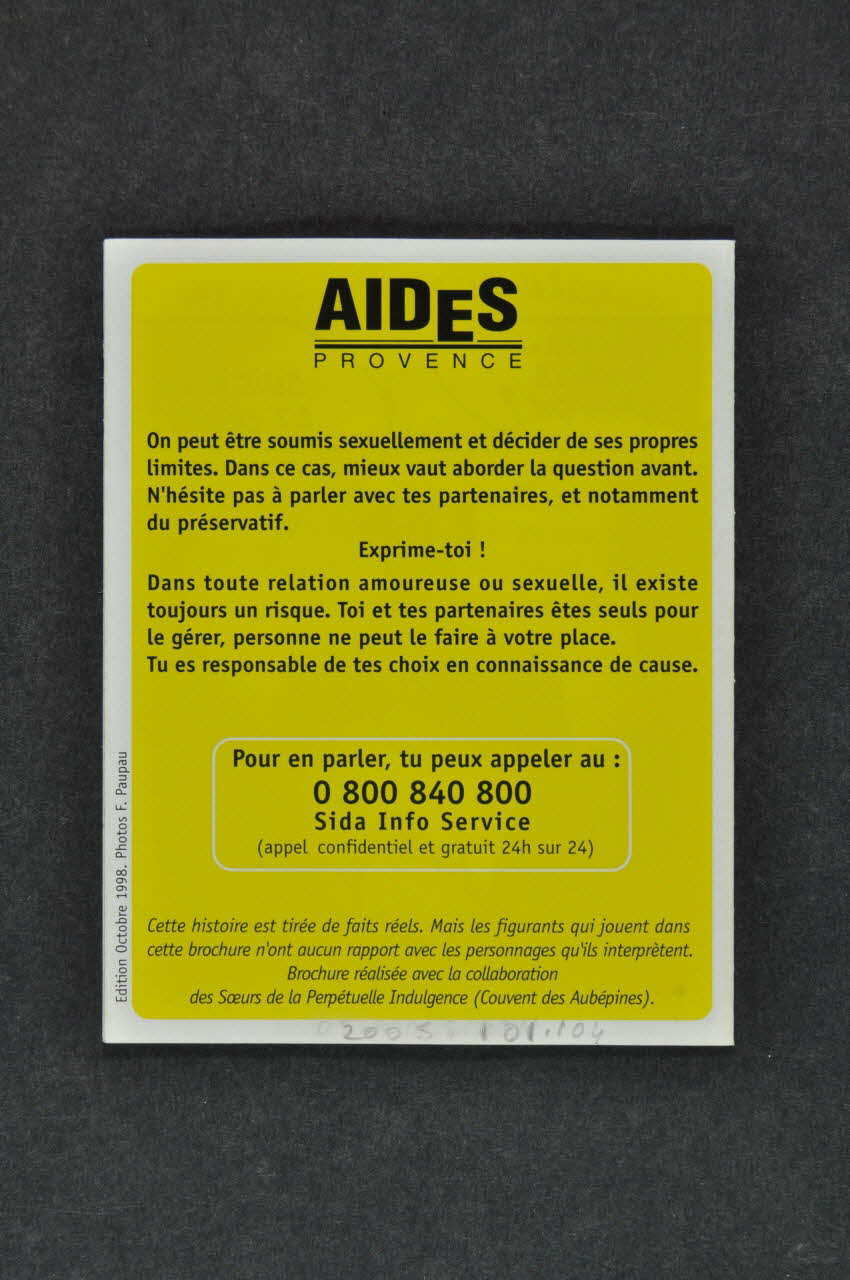 AIDES // PROVENCE (inscription en noir sur fond jaune, en haut au milieu du dos du dépliant), versoNuméro