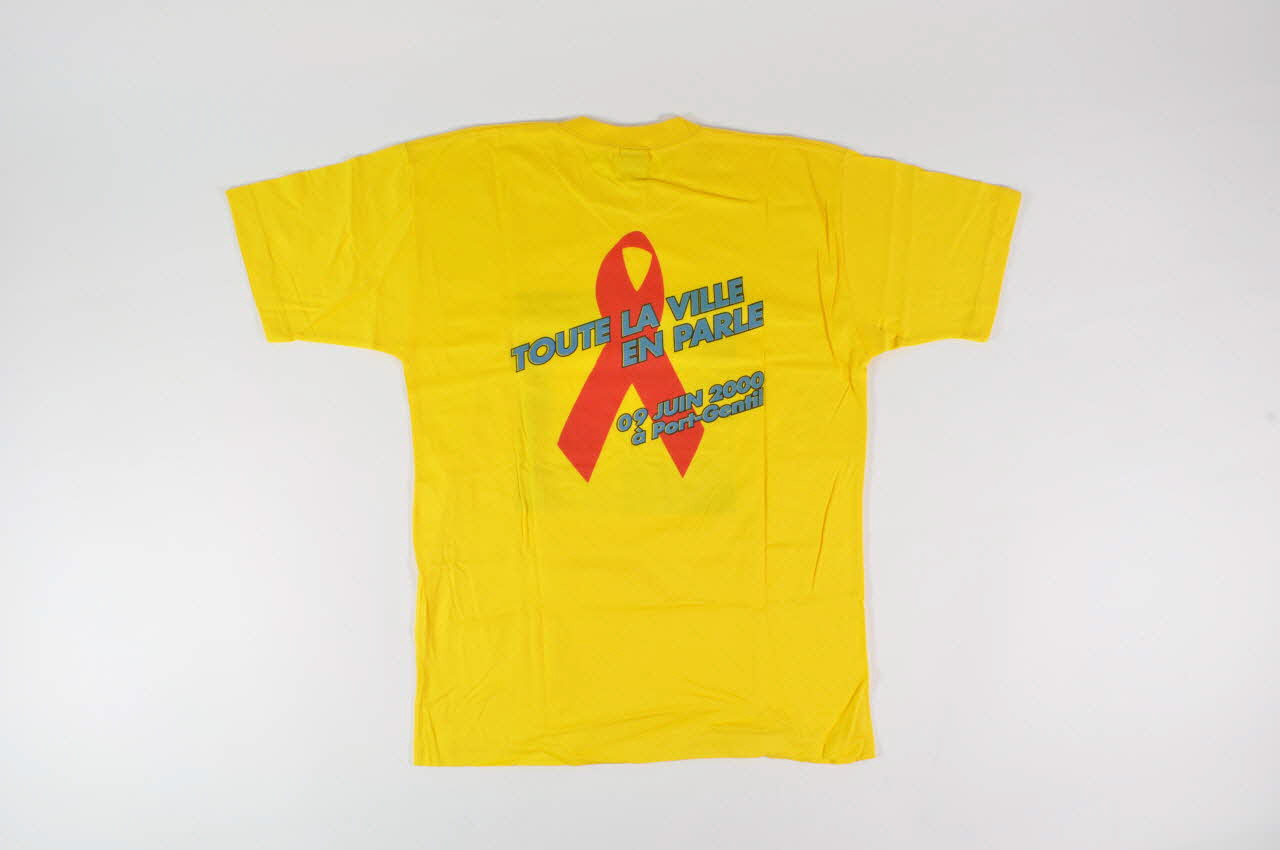 TOUTE LA VILLE / EN PARLE / 09 JUIN 2000 / à Port-Gentil (Inscription et date inscrites en bleu, cernée de noir, au dos du T-shirt.)COLOUR® / TAKINGNESS / GUARANTEEN ON COLOUR FAST / 100% COTTON / Made in Thailand (Etiquette cousue à l'intérieur du col. Elle est en tissu blanc avec des traits de couleurs rouge, jaune et vert et des inscriptions noires.)Décor