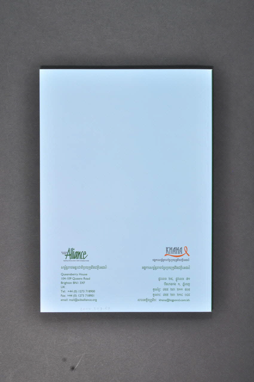 Khmer HIV/AIDS NGO Alliance (KHANA) // PO Box 2311 // Phnom Penh 3 // Cambodia (en bas de la première page.), à l'intérieurLogo, inscription concernant le commanditaire, nom d'association