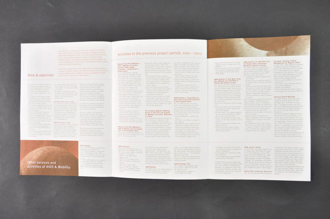 Dépliant, "Aids and mobility. Activity report 2001-2003. Plan of action 2004-2006" (Sida et mobilité. Rapport d'activité 2001-2003. Plan d'action 2004-2006.)