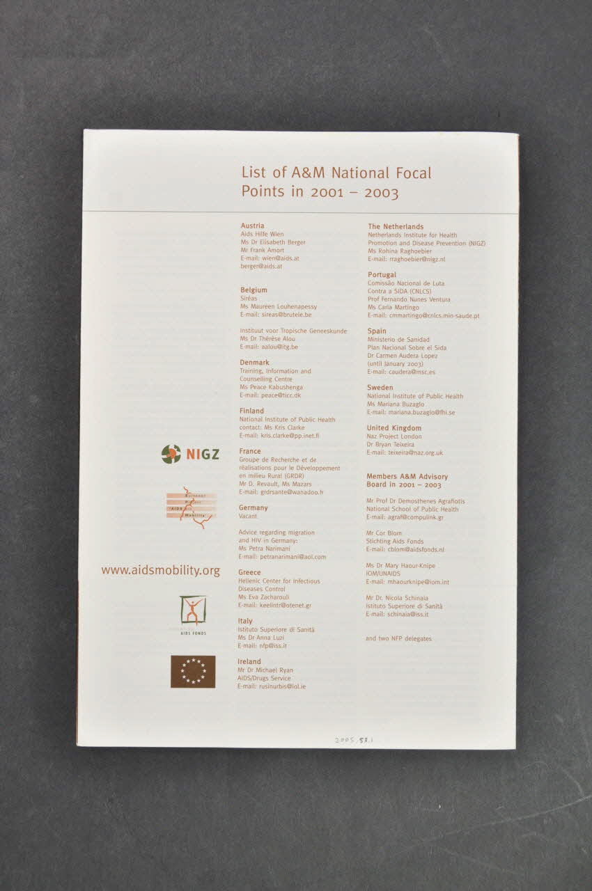 List of A&M National Focal // Points in 2001-2003 // // Austria // Aids Hilfe Wien // Ms Dr Elisabeth Berger // Mr Frank Amort // E-mail: wien@aids.at // berger@aids.at // // Belgium // [...] (Adresses en caractère bruns), versowww.aidsmobility.org (En bas, à gauche), sur la couvertureLogo