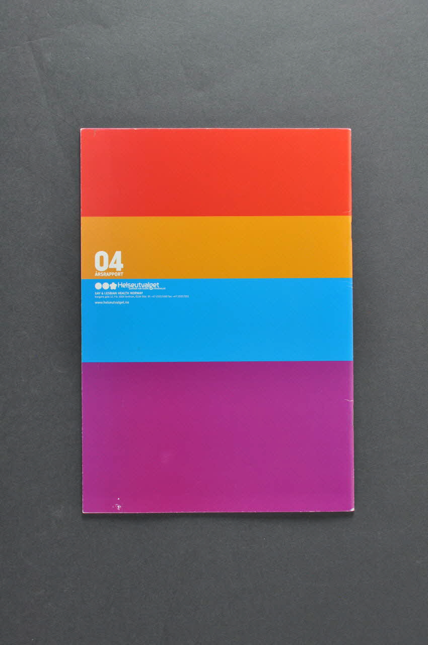 Celle-ci est traversée au centre, d'un bandeau blanc avec le logo et le nom de l"association. Au dos, le fond est divisé dans le sens de la largeur en quatre parties inégales de couleur rouge, orange, bleue, violette (la plus large). A gauche, en blanc sur les fonds orange et bleu, de nouveau "04 Ärsrapport" et les coordonnées de l'association. L'intérieur présente sur un fond blanc, des impressions en noir sur deux colonnes, avec titres et sous titres en bleu, rose, orange, violet (selon les parties). De nombreuses photographies couleur pleine page de l'association, dont des affiches de prévention avec préservatifs, illustrent les pages.Décor