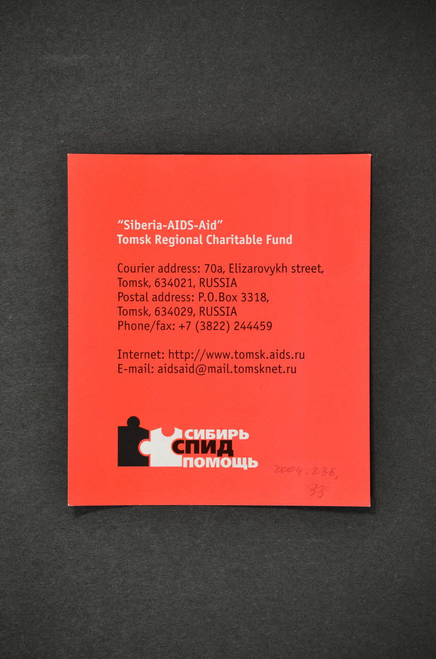 "Siberia-AIDS-Aids" // Tomsk Regional Charitable Fund // // Courier address: 70a, Elizarovykh street, // Tomsk, 634021, RUSSIA // Postal address; P.O. Box 3318, // Tomsk, 634029, RUSSIA // Phone/ fax: +7 (3822) 244459 // // Internet: http: //www.tomsk.aids.ru // E-mail: aidsaid@mail.tomsknet.ru (En blanc et noir.), versoDécor