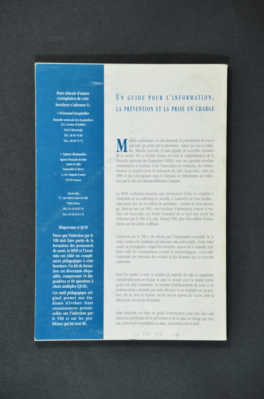 L'ÉPIDÉMIE // CONTAMINATION ET PRÉVENTION // L'INFECTION PAR LE VIH // ASPECTS SOCIAUX // LA PRISE EN CHARGE // LA PRÉVENTION EN MILIEU DE SOINS // POUR EN SAVOIR PLUS (Titres des grandes parties des textes de la brochure), à l'intérieurDate