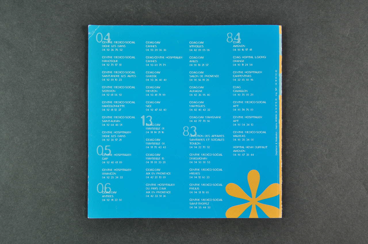 numéros de téléphone des centres de dépistage classés par département (inscription en blanc sur fond bleu au dos du dépliant), versoTexte