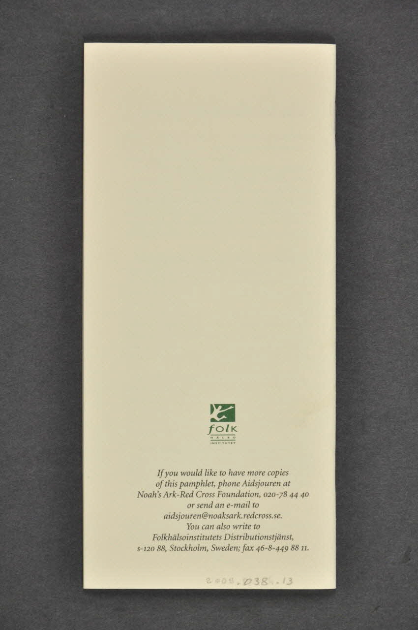 Troisième brochure d'une série de trois (2005.038.11 / 2005.038.12 et 14 / 2005.038.13 et 15) Version suédoise en 2005.038.15. L'auteur de la brochure est Lars Moberg, médecin infectiologue à l'hôpital de Huddinge, président de Swedish Physicians against Aids, membre des bureaux de Noah's Ark_Red Cross Foundation et de la fondation Research fund of Swedish Physicians against Aids. (dernière page). Il s'agit de la deuxième édition (2000) de la brochure (la première édition a été publiée en 1993) Remerciements au Terrence Higgins Trust dont les brochures ont inspiré cette brochure.