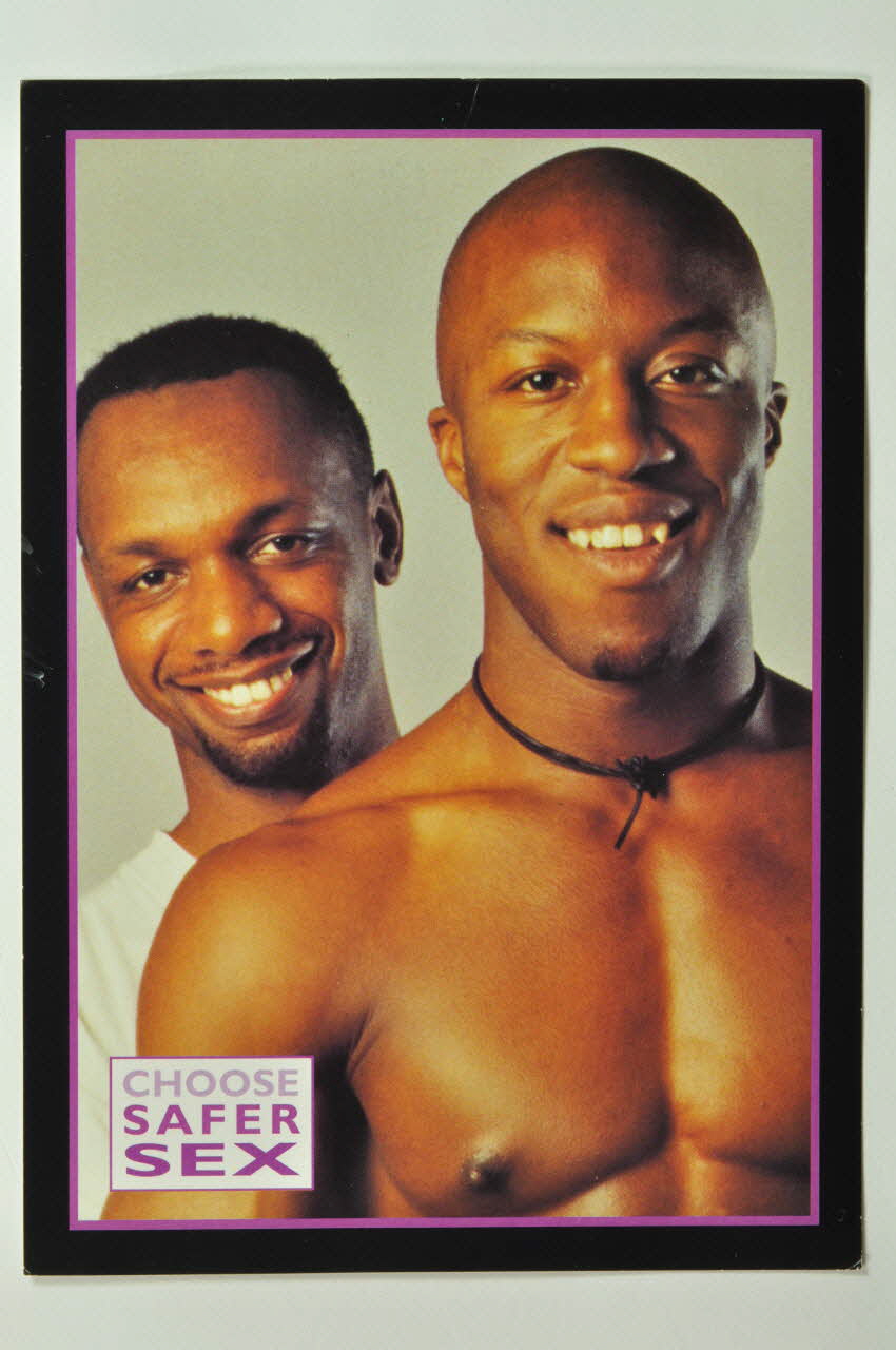Au recto on peut voir une photographie en couleur de deux hommes noirs souriants, l'un est torse nu. Ils sont l'un derrière l'autre. La photo est encadrée par un filet violet et un bandeau noir. En bas, à gauche dans un rectangle blanc, en capitales violettes on peut lire le slogan de la campagne. Le verso a un fond blanc avec un texte en noir entouré d'un filet violet. En haut, en lettres couleur "arc en ciel", il y a de nouveau le slogan et en dessous, en petites capitales bleues un titre suivi d'un texte en anglais. En dessous on peuit voir les lignes téléphoniques (en rouge) de différentes associations. Tout en bas se trouve le logo de l'association à l'origine de cette campagne.Inscriptions