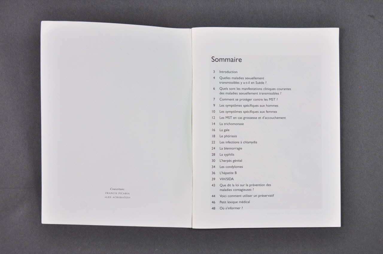 - Introduction // - Quelles maladies sexuellement transmissibles y a-t-il en Suède ? // - Quels sont les manifestations cliniques courantes des maladies sexuellement transmissibles ? // - Comment se protéger contre les MST ? (safer sex) // - Les symptômes spécifiques aux hommes // - Les symptômes spécifiques aux femmes // - Les MST en cas de grossesse et d'accouchement // (pour chacune des MST ci dessous : mode de transmission, symptômes, diagnostic, traitement, quelle attitude adopter fece à son partenaire) // - Trichomonase // - La gale // - Le phtiriasis // - Les infections à chlamydia // - La blennorragie // - La syphilis // - L'herpès génital // - Les condylomes // - L'hépatite B // - VIH/Sida // - Que dit la loi sur la prévention des maladies contagieuses ?` // - Voici comment utiliser un préservatif (9 schémas couleur légendés) // - Petit lexique médical // - Où s'informer? (à l'intérieur)Décor