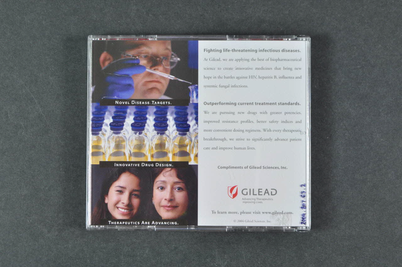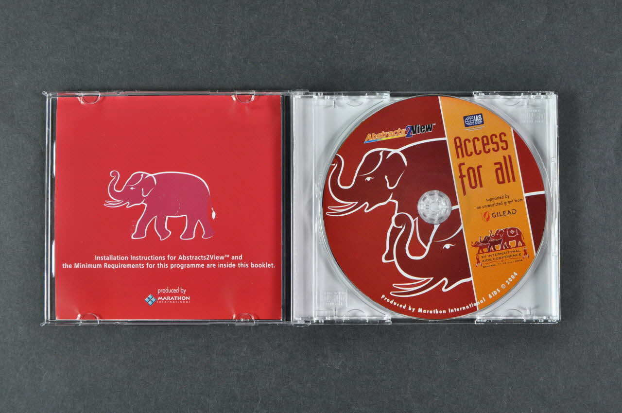 Le recto du CDrom et celui de la pochette présentent le même décor : sur fond rouge, deux éléphants levant la trompe, un bandeau verticale jaune à droite, portant des inscriptions. L'intérieur du fascicule comporte des instructions en rouge sur fond blanc, et l'arrière un éléphant rouge sur fond rouge. Un feuillet de papier imprimé est inséré à l'arrière du boîtier. Il comprend un texte noir à droite, et trois photographies couleur à gauche : scientifique maniant une pipette, flacons remplis d'un liquide jaune, deux femmes souriantes. Le CDrom contient une base de donnée avec recherche par auteur.Inscriptions