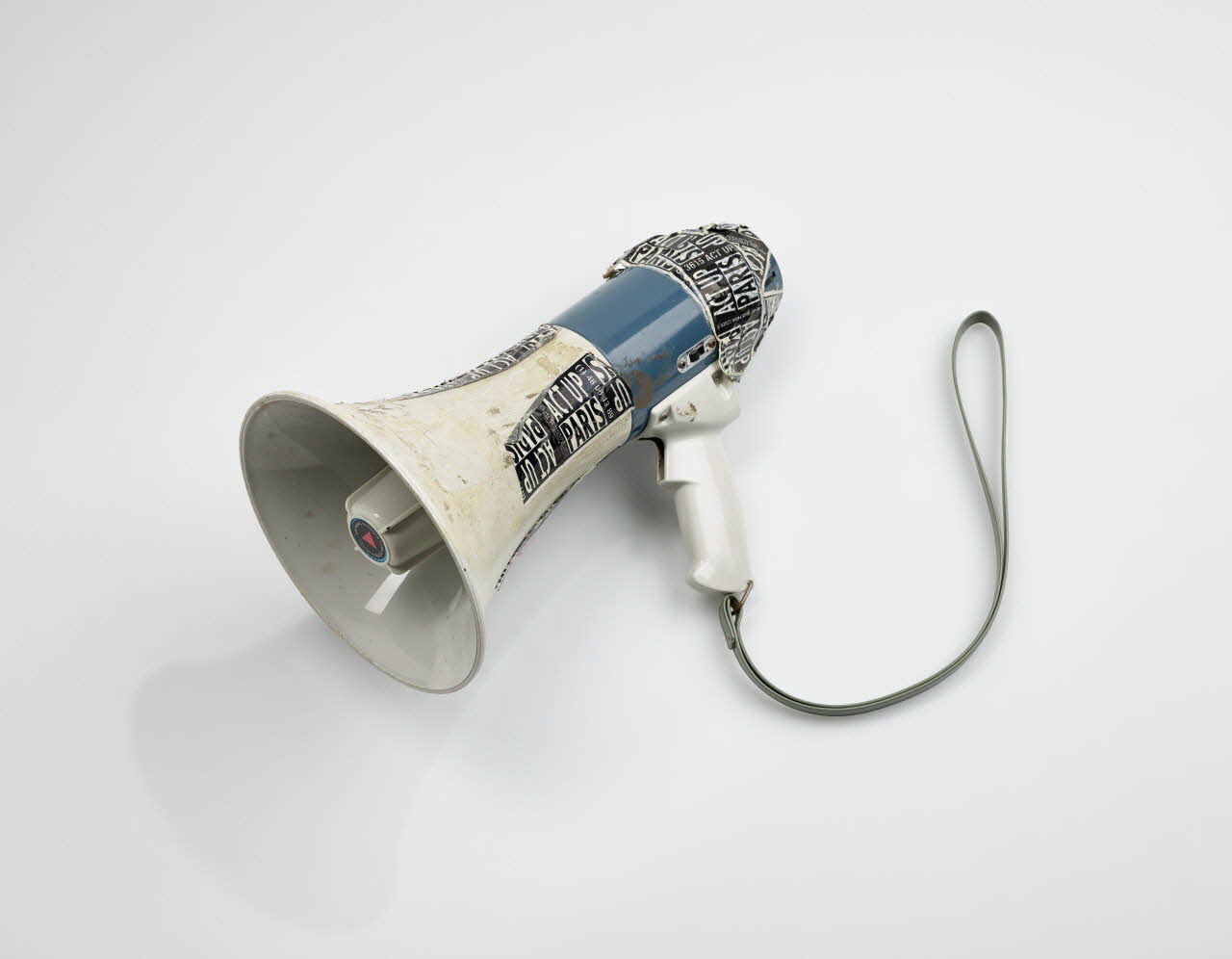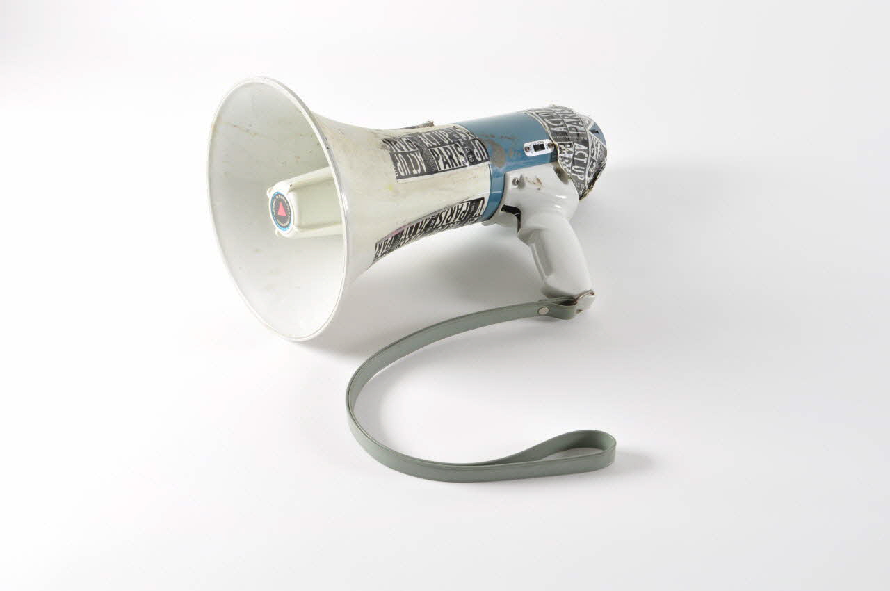 Une molette, à la base du manche, permet de régler le volume du son tandis qu'au-dessus du manche, un bouton permet d'allumer ou éteindre le porte-voix. Une bande autocollante portant des inscriptions imprimées en noir et blanc est enroulée autour de l'arrière du porte-voix. Quatre morceaux de longueurs inégales de cette même bande autocollante sont collées sur la moitié grise. Un petit autocollant circulaire noir, comportant un petit triangle rose au centre et présentant un slogan en caractères blancs, est collé au centre du pavillon.Inscriptions