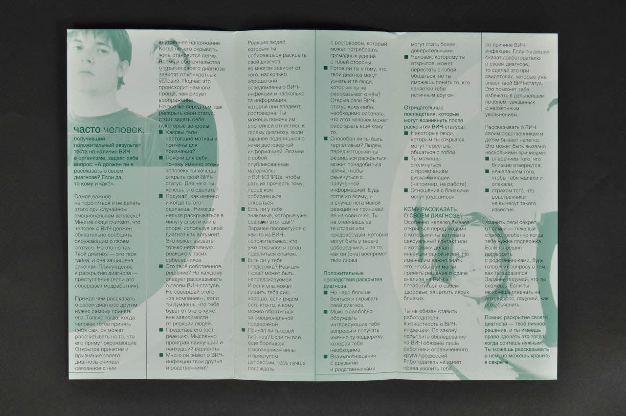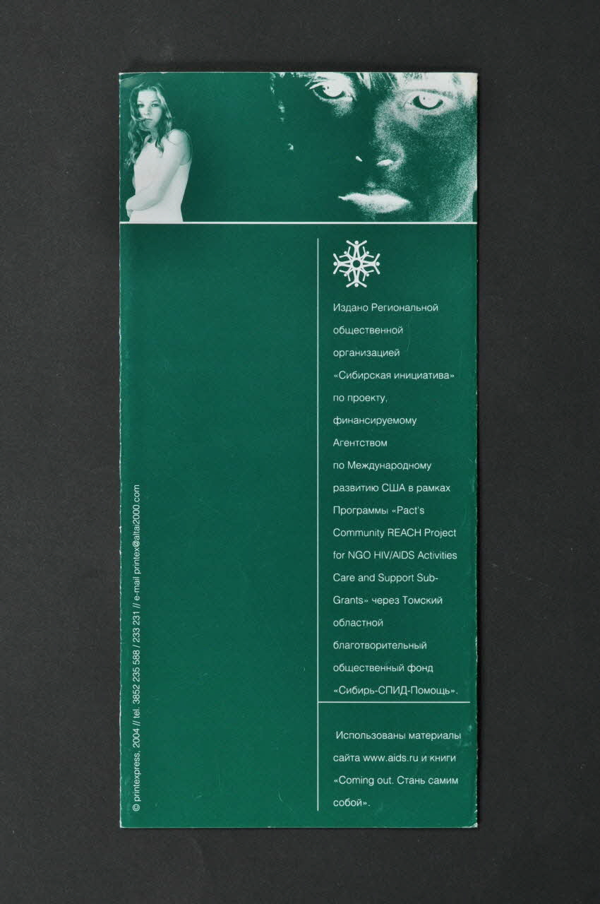 Sur le verso, dans la partie supérieure, une photographie montre deux femmes en effet "négatif" dont une est un portrait. Dans la partie gauche du dépliant, on y voit un logo de couleur blanche sous lequel est inscrit une liste en blanc sur fond bleu. A l'intérieur du dépliant est inscrit un texte en russe, en petit caractère de couleur noire. La face interne du premier volet est illustrée d'une photo de deux hommes et d'une bande en forme de lune de couleur blanche. La face interne du dernier volet est illustrée d'un portrait féminin.Inscriptions