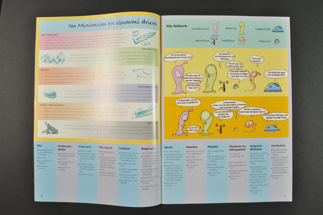 - p.8 à 11 Dossier sur les préservatifs : mode d'emploi (6 schémas, conseils, différents modes de prévention, BD...