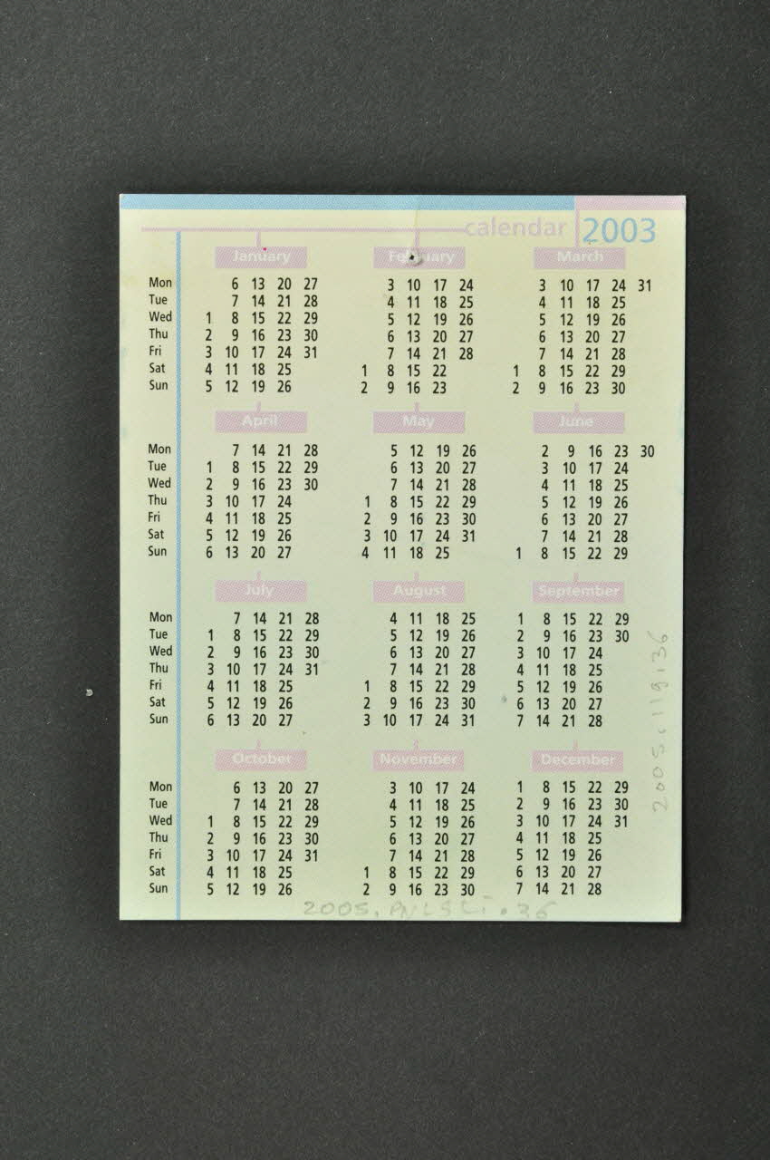 Cette carte est en papier cartonné imprimé en quadrichromie sur ses deux faces. Elle fait fonction de calendrier pour l'année 2003 et comporte différentes inscriptions en trois langues (anglais, arabe, français).Décor