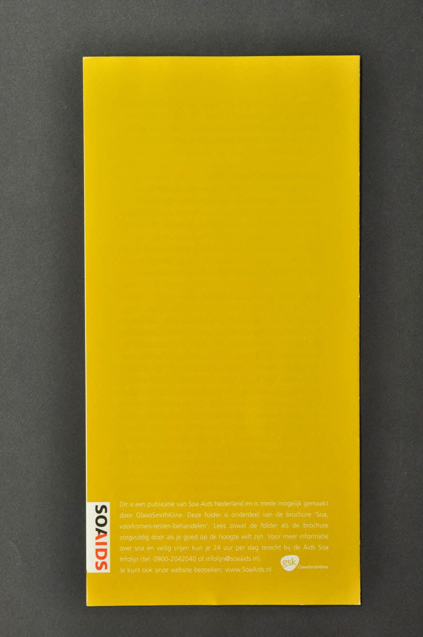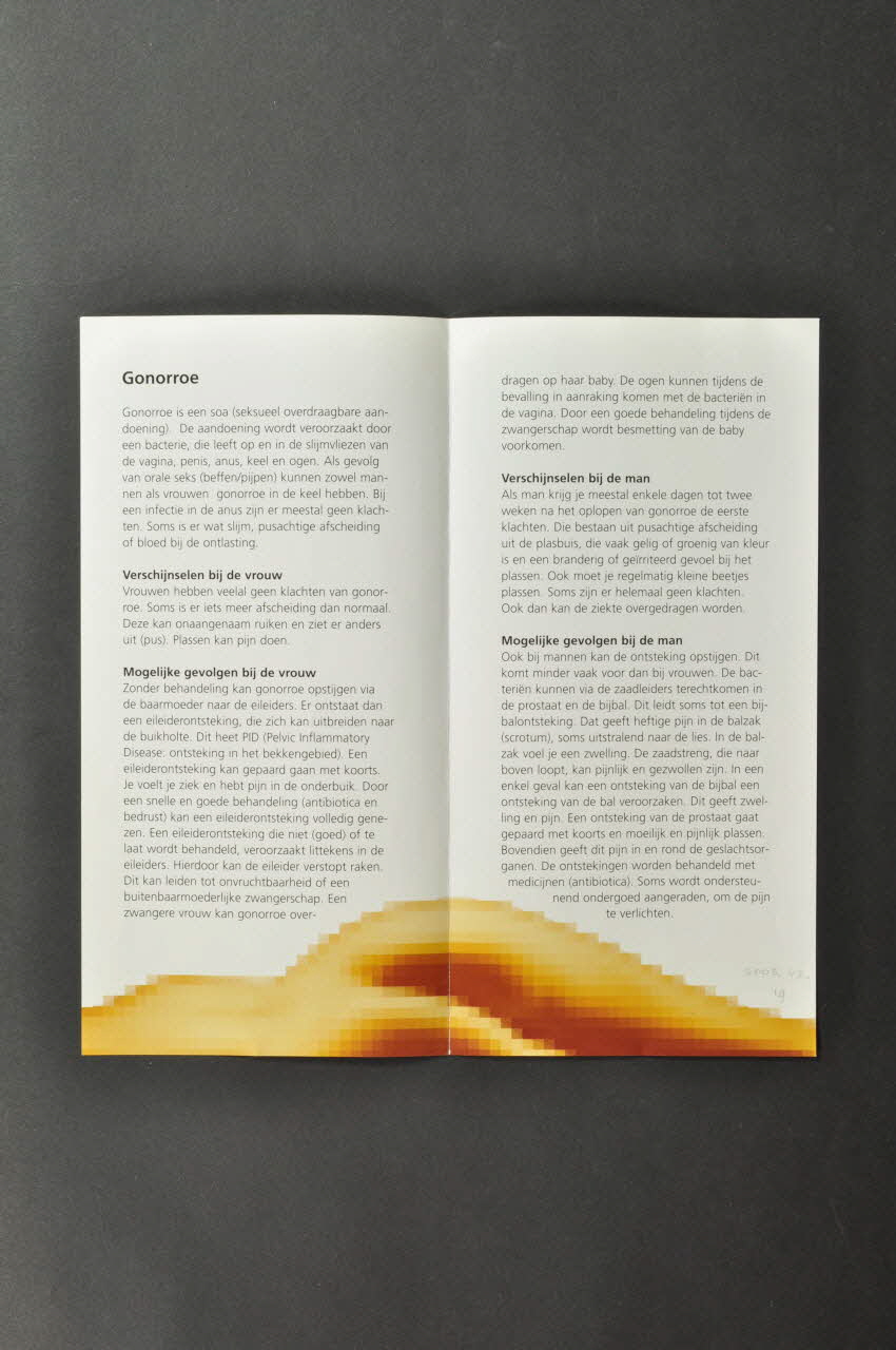 Sur la couverture jaune on peut voir en haut le titre, sur le côté le logo de l'association et en bas son adresse internet. Une image très pixellisée illustre cette couverture. A l'intérieur se trouve un texte en lettres noires sur un fond blanc, il présente une maladie sexuellement transmissible. Le dos est jaune avec des informations sur l'association.Inscriptions
