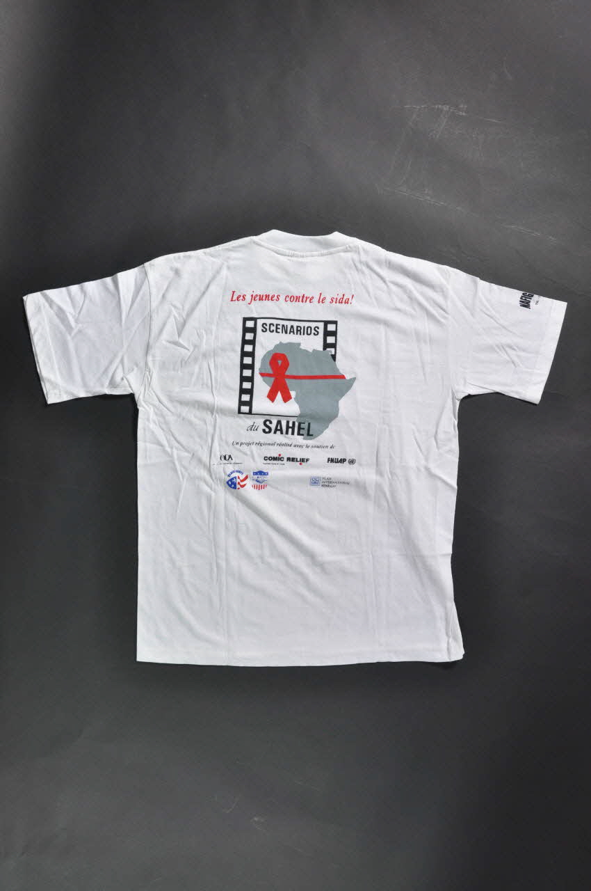 Devant, sur la gauche du tee shirt, se trouve le logo de l'opération, un dessin de pellicule de film noire. Sur la pellicule est dessinée une carte de l'Afrique en gris barrée d'un trait rouge faisant toute la largeur de la carte, terminé par un ruban rouge.