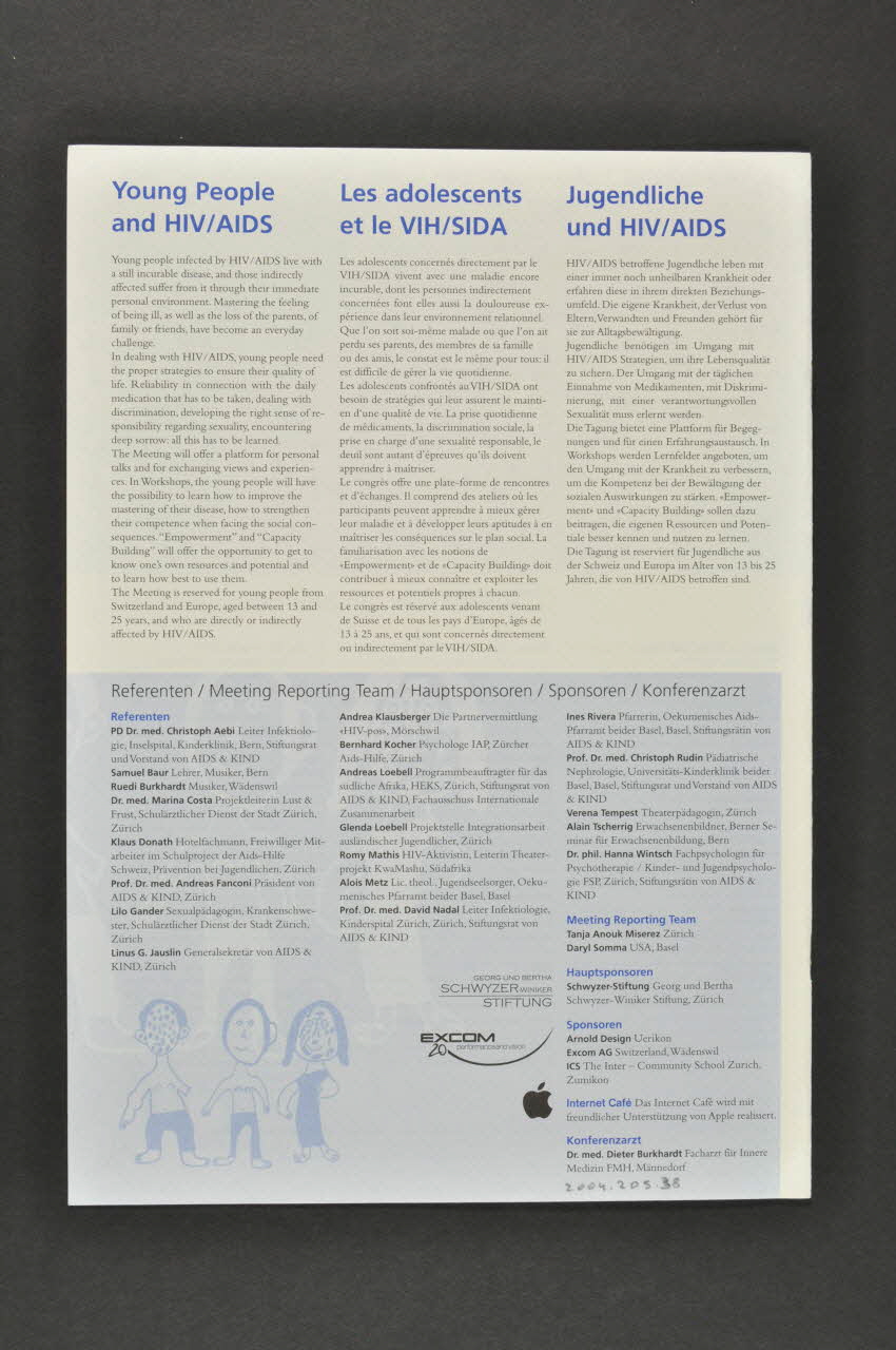 relié avec deux agrafes / De format rectangulaire, le livret présente une couverture avec un bandeau bleu à inscriptions bleues en partie haute et un dessin d'enfant de trois personnages en bleu clair en bas, sur fond blanc.