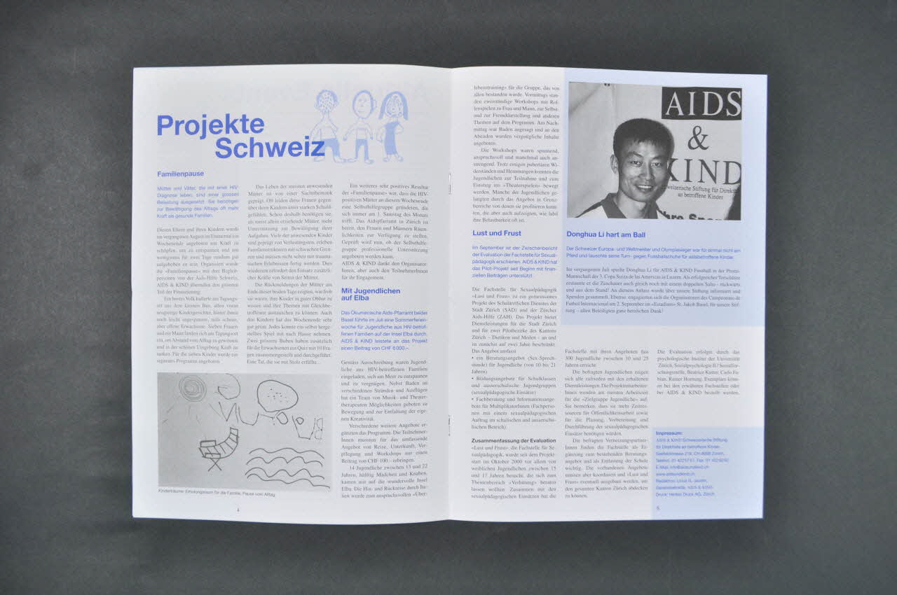 Le bulletin développe les thèmes suivants: Les évènements d'actualité : l' exposition de Daniel Wüthrich "Hope & Dreams" à Zurich, en faveur de l'association; La Journée mondiale du sida 2001 à Zurich à Berne Des pages quatre à cinq figurent les projets conduits en Suisse; La prise en charge d'une partie du financement de la "pause familiale" organisée par l'Aide suisse contre le Sida (récit) contribution financière à la semaine sur l'île d'Elbe d'adolescents concernés par le VIH, organisée par l'aumônerie oecuménique de Bâle; Le rapport d'évaluation du service de psychopédagie de l'éducation sexuelle de Zurich. Des pages six à huit ont trouve les projets internationaux : la réussite du projet pilote Sindi en Afrique du sud (et arrêt prévu de la participation : succès); La commission "International" de l'association (aide à la Roumanie); Le projet en Ouganda pour les orphelins du sida; Le financement de maisons pour les grand parents en Afrique; L' élaboration d'une banque de données internet sur les projets conduits en Afrique.Décor