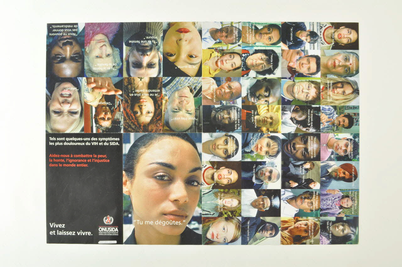 Affiche rectangulaire en papier imprimée sur les deux faces. Sur une face, un rectangle noir est imprimé au centre avec les slogans et le logo de ONUSIDA. Autour des petites photographies de personnes de tous âges et de toutes origines.