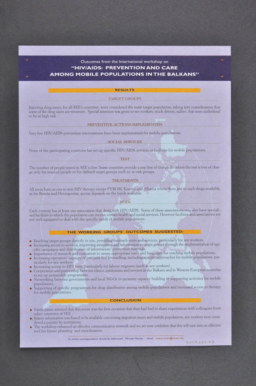 Outcomes from the International workshop on HIV/AIDS : prevention and care among mobile populations in the Balkans (En partie supérieure. Le titre est répété dans un bandeau bleu en partie supérieure du verso.), rectoDate, concernant le lieu d'utilisation