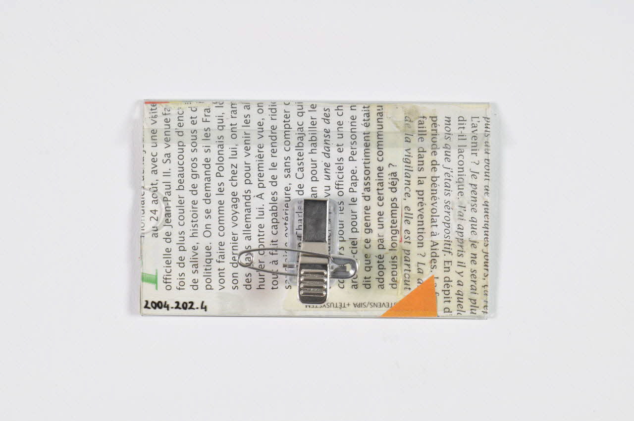 De format rectangulaire et vertical, le badge est constitué d'un découpage et d'un collage à la colle ou au ruban adhésif de papiers imprimés en couleur. Il représente le pape assis, dont le camail est coloré en arc en ciel. Il est encadré d'inscriptions orange sur fond blanc, blanche sur fond jaune et blanche sur fond marron. L'image est protégée par un plastique, qui s'ouvre à l'arrière grâce à un rabat. L'attache se fait au dos, à l'aide d'une patte en métal moulé sur ressort. Une épingle à nourrice en métal argenté est insérée dans ce système.Décor