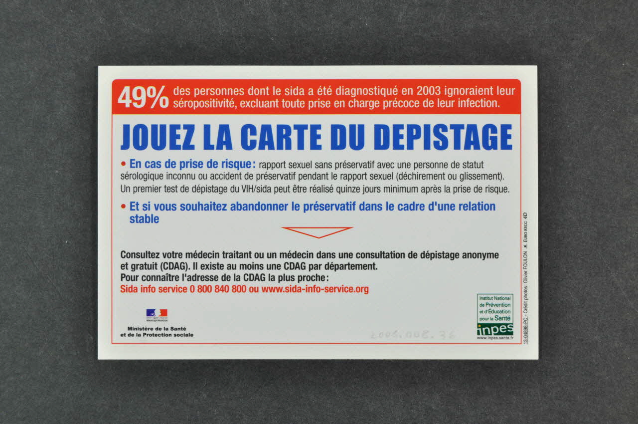 49 % des personnes dont le sida a été diagnostiqué en 2003 ignoraient leur séropositivité, excluant toute prise ne charge précoce de leur infection (Texte imprimé en blanc dans un encadré rouge placé dans la partie supérieure), versoJOUEZ LA CARTE DU DEPISTAGE (Texte imprimé en capitales bleues sur fond blanc, dans la longueur de la carte), versoCatherine est divorcée, elle vient de rencontrer Bertrand. Elle croise son amie Marie et lui raconte son aventure. Discussion entre filles (Texte en petits caractères blancs sur fond noir situé juste en dessous du titre et présentant, en deux lignes, l'histoire de la carte), recto- En cas de prise de risque : rapport sexuel sans préservatif avec une personne de statut sérologique inconnu ou accident de préservatif pendant le rapport sexuel (déchirement ou glissement). Un premier test de dépistage du VIH/sida peut être réalisé quinze jours minimum après la prise de risque // // - Et si vous souhaitez abandonner le préservatif dans le cadre d'une relation stable (Texte imprimé en noir ou bleu sur fond blanc et divisé en deux points rouges), versoDécor