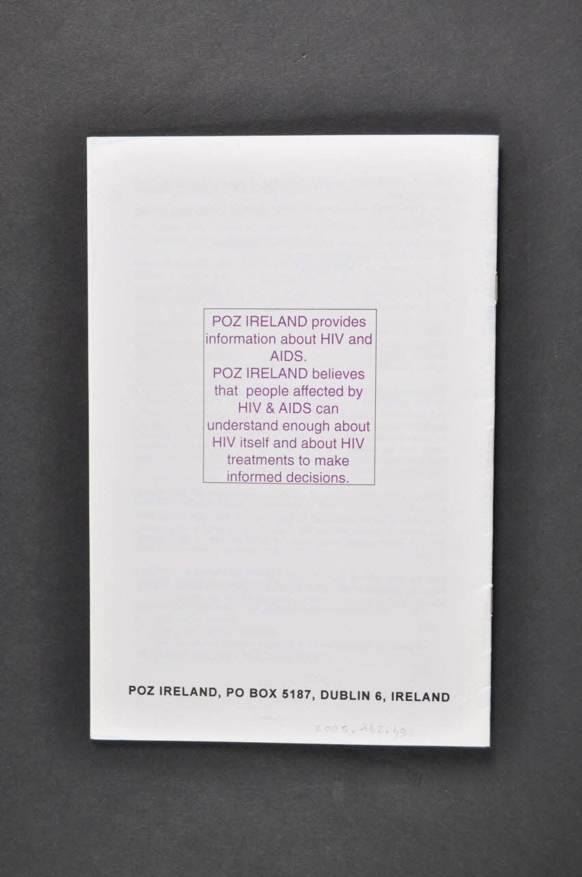 POZ IRELAND provides // informations about HIV and AIDS. // POZ IRELAND believes that people affected by // HIV and AIDS can understand enough about // HIV itself and about HIV treatment to make informed decisions. (en violet), versoDécor