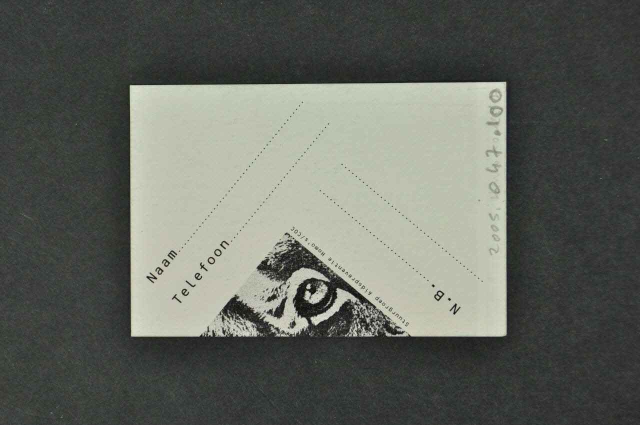La carte est en carton imprimé noir sur fond blanc. Elle constitue une carte de rendez-vous. Au recto, des inscriptions blanches et un fragment de dessin de format carré se détachent sur une photographie en noir et blanc, représentant un groupe de trois hommes à demi nus: un homme noir et un homme blanc assis l'un sur l'autre, et un homme blanc tenant un faucon à l'arrière plan. Au verso, sur fond blanc, des inscriptions noires disposées en biais encadrent le même fragment de dessin de format carré qu'au recto, illustrant l'oeil d'un félin. C'est sur cette face que le rendez-vous est pris, en inscrivant son nom et son numéro de téléphone.Inscriptions