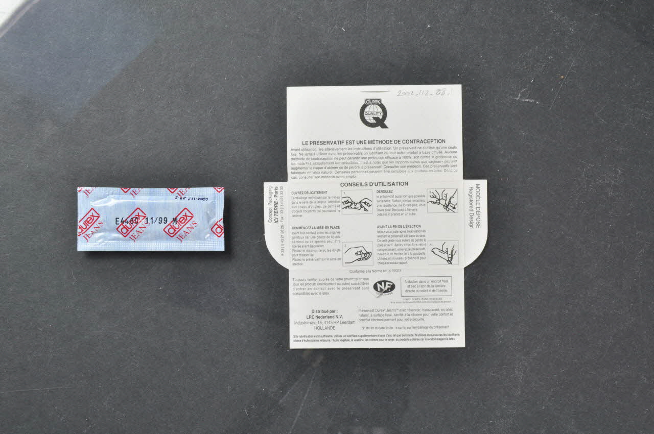 L'enveloppe est rangée dans une pochette rectangulaire en carton blanc, se fermant par une languette s'insérant dans une encoche. La pochette est couverte d'inscriptions. L'avant présente une photographie de Pierre et Gilles, figurant un couple debout sortant d'un puit. Sur les rabats on trouve les coordonnées du Kiosqie et de centres de dépistages à Paris. A l'intérieur sont imprimés des conseils d'utilisation et quatre schémas en caractères noirs.Inscriptions