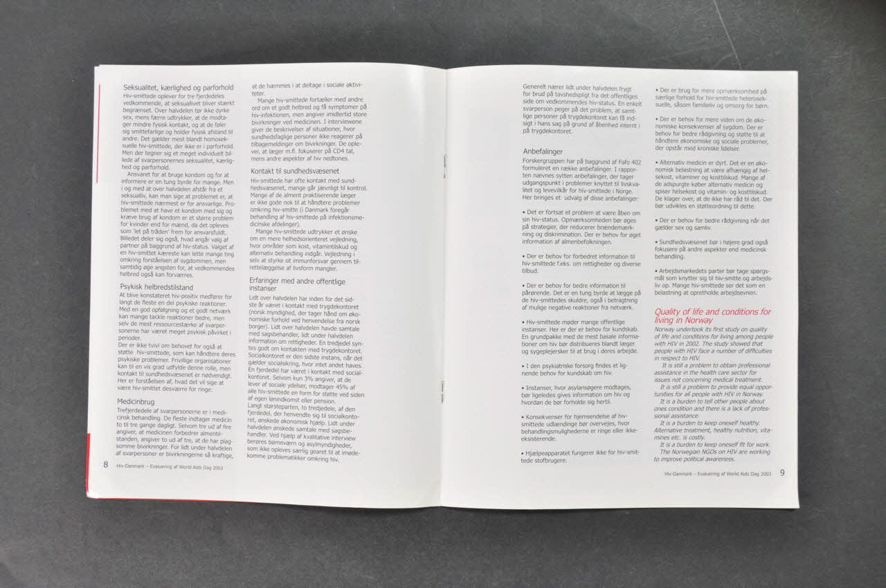 La couverture se divise en trois parties: un bandeau rouge comportant un logo, le titre du rapport et la date en blanc, une photographie d'un brassard porté par les membres de Aids-Fond le 1er décembre 2003 sur lequel se trouve une inscription rouge, et un bandeau rouge contenant le sommaire en blanc. Le dos se compose de la même manière: deux bandeaux rouges entourant un bandeau gris où est inscrit un texte de remerciement aux contributeurs sur deux colonnes - la version en danois puis la version en anglais. L'intérieur, sur fond blanc, comporte des textes bilingue en caractères noirs disposés sur deux colonnes, parfois contenus dans des encarts gris ou rouges, surmontés de titres rouges. Quelques photographies noir et blanc ponctuent le propos.Inscriptions