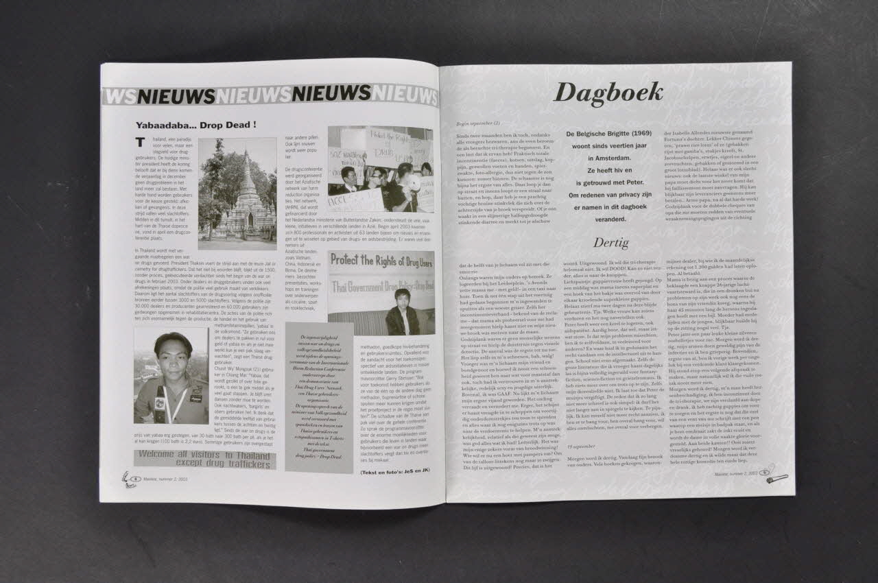Sommaire (traduire les titres) - p.4 Zwakke plek (résumé dans le sommaire) - p.6 Nieuws : Drugs in Thailand (résumé dans le sommaire) / Cannabis als medicijn - p.9 Dagboek : (Journal de Brigitte) : Dertig - p.10 Sigaretten : tot de dood ons scheidt (résumé dans le sommaire) (signalé en couverture) -p.12 Ademnood : over de longen (résumé dans le sommaire) (signalé et photo en couverture) - p.16 Dope roken ?? - p.18 Portret Annies : "Ik zit tot Sint Juttemis aan de inhalers" (résumé dans le sommaire) - p.20 Gezondheidsnieuws : SARS houdt Azië in haar greep - p.22 Beatrixoord in Haren : Tuberculosecentrum Beatrixoord - p.23 Puzzel : mots croisés - p.24 Persoonlijk : Photo et présentation de Werner Fleck, usager de drogue ??. Encart : 4 cartes postales éditées par l'association : "Ceci n'est pas une pipe de crack / briquet allumant une pipe / "Hoe base jij ?" / "Ontwerp de ideale basepip" / Special Longen (Spécial Poumons ??) / En page 2 et 3, extrait du sommaire avec résumé des articles principaux, et sommaire des rubriques, tous les articles n'y figurent pas.