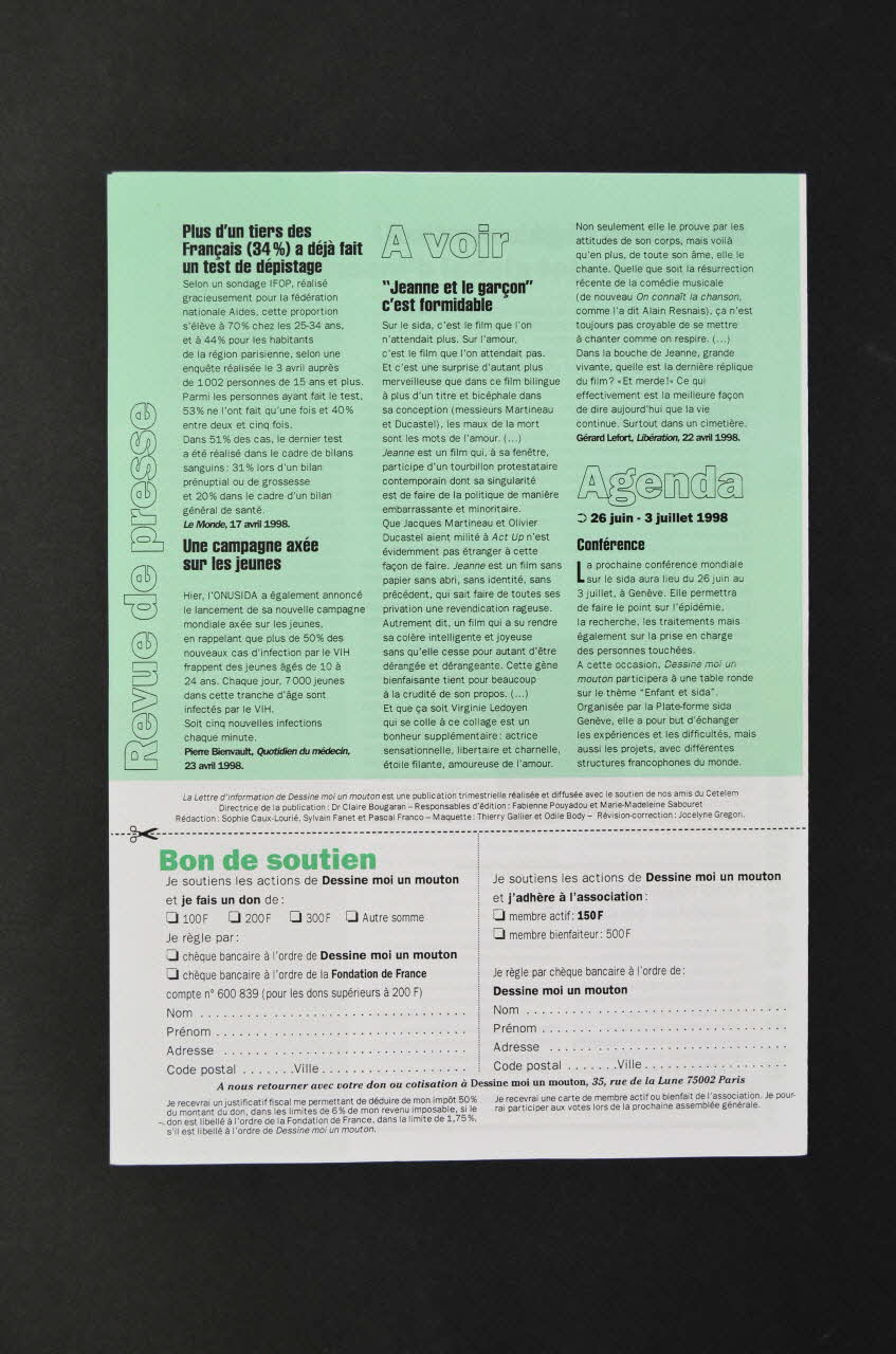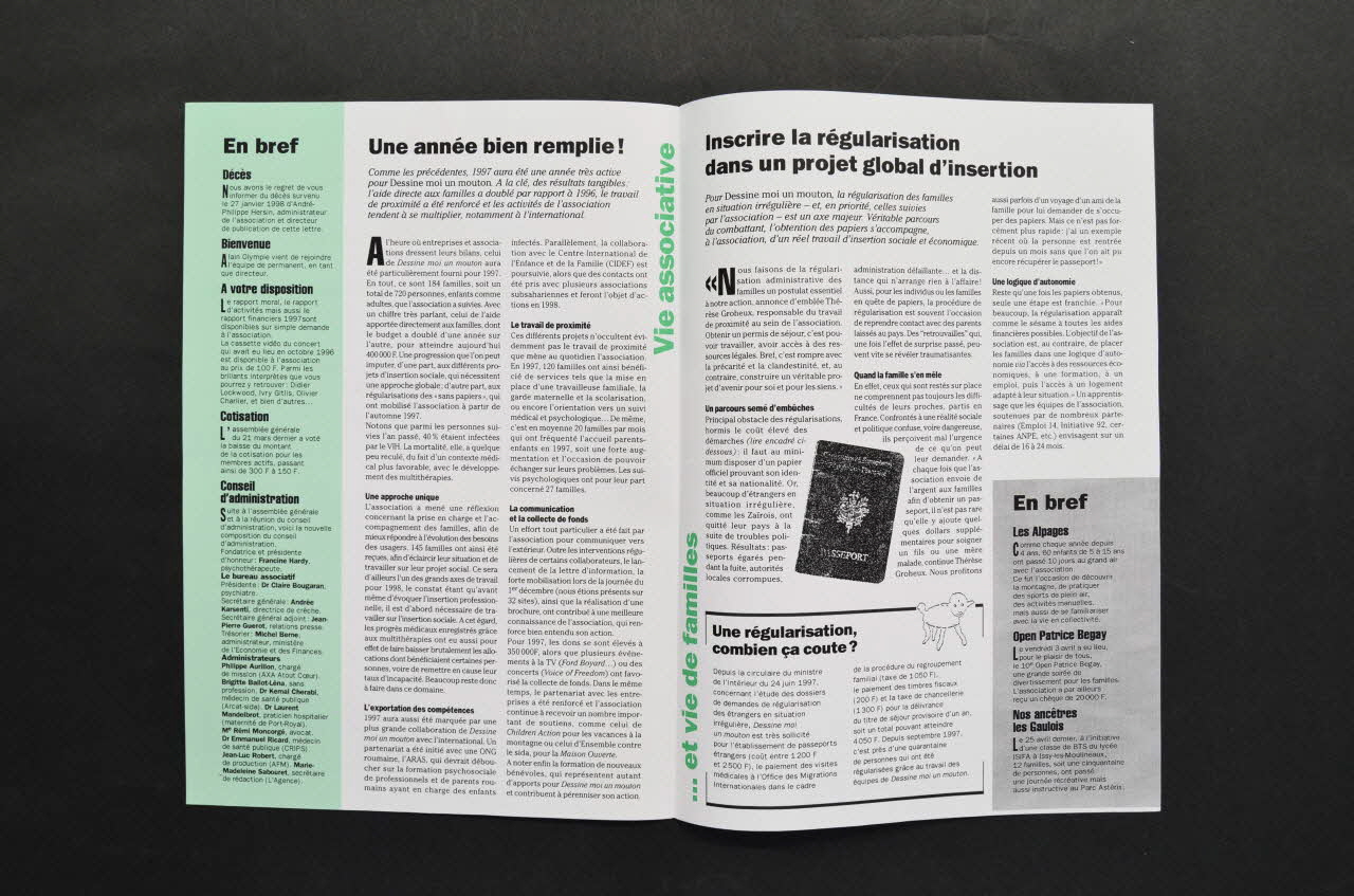 Dans un encadrement à fond vert, à gauche, on trouve un éditorial signé de la présidente. Il y a un texte à droite signé et illustré d'une photo. En bas il y a les coordonnées de l'association. Au dos il y a un appel aux dons sur fond blanc en bas. En haut il y a une revue de presse et l'agenda de l'association sur un fond vert. A l'intérieur il y a plusieurs textes. Ceux sur le côté gauche sont sur un fond vert, les autres sur un fond blanc. Un mouton dessiné illsutre un encart.Inscriptions