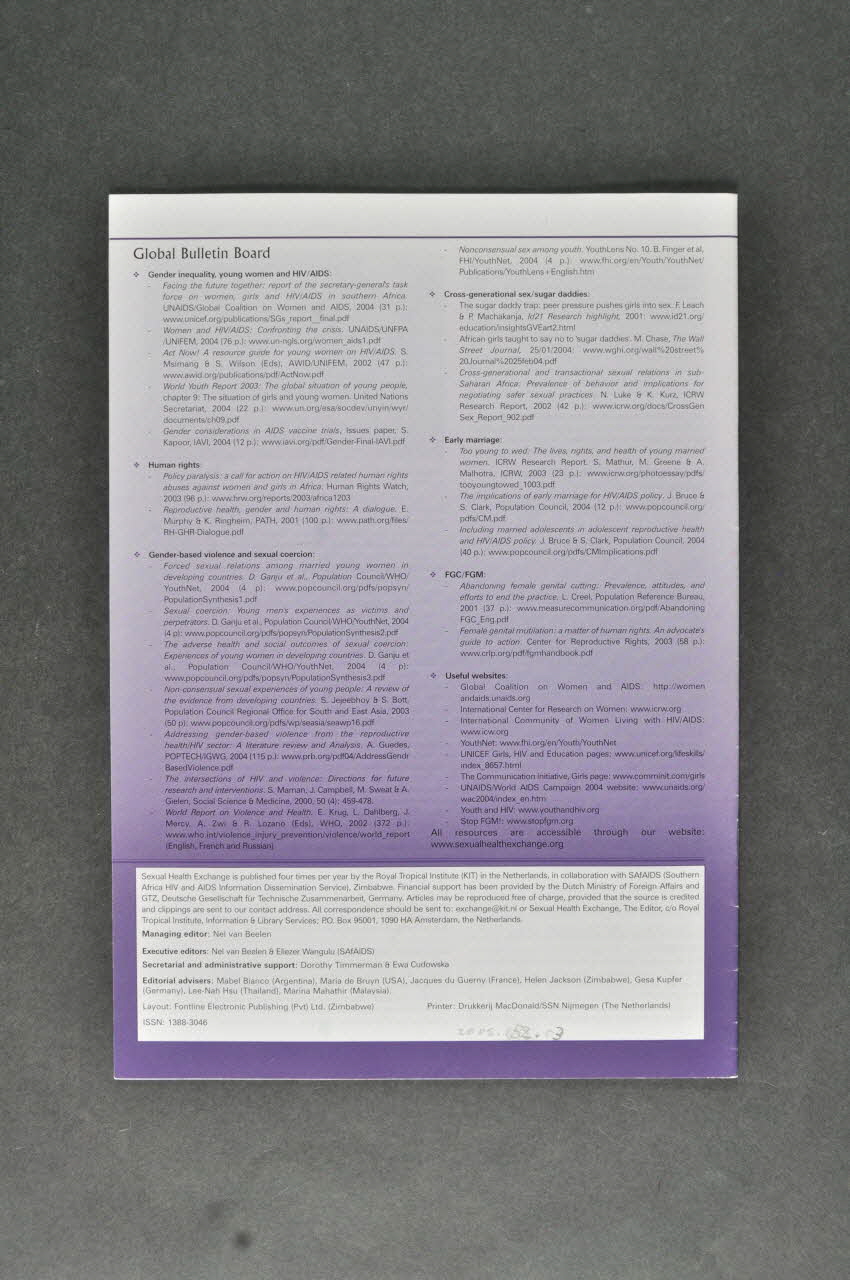 Girls and young // women // Editorial...1 // Special Arcticles...5 // Research Notes..10 // Intervention Planning...14 // Country Watch...16 // Programme Features...17 // Policy Notes...22 // Programme Features...28 // Global Bulletin Board...32 // Next issue: Marginalized // populations (Le sommaire, en caractères mauves et noirs, se trouve dans la partie gauche de la première de couverture.), sur la couvertureDate