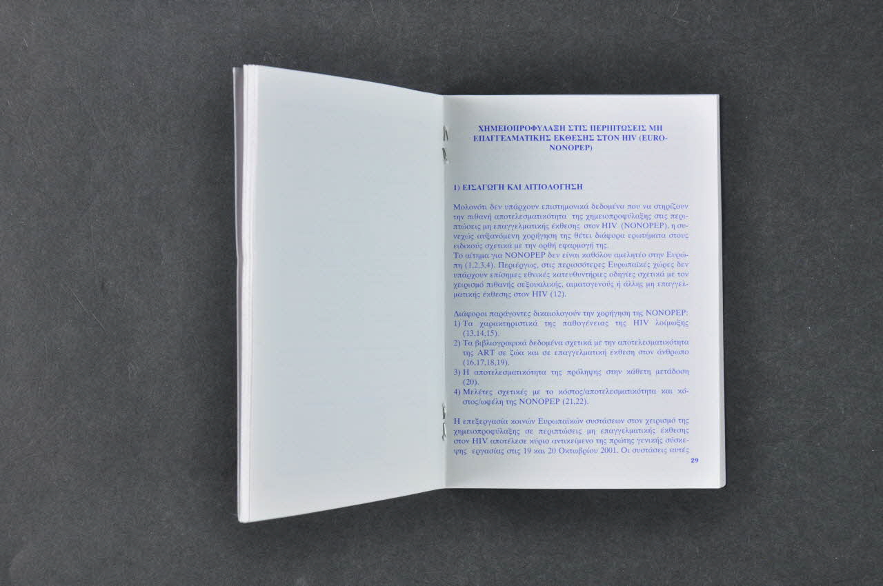 Brochure de format rectangulaire en papier blanc imprimé en bleu, avec une couverture en papier cartonné imprimée en couleur. Elle est en grec et comprend 56 pages.