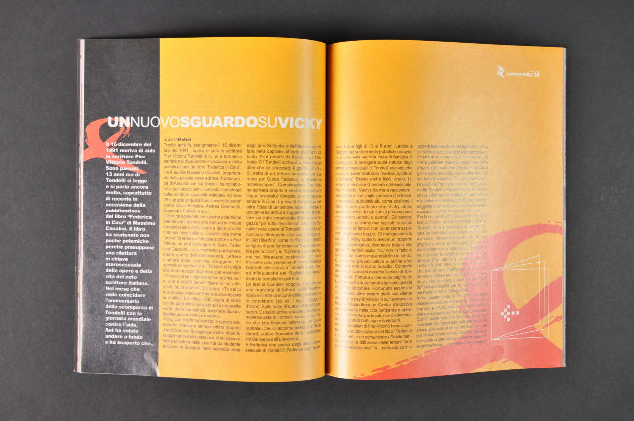 Revue culturelle et politique gaie. Les élections aux USA, idées de cadeaux de Noël, critiques de livres et de films, referendum sur le mariage homosexuel. p.18-29 Dossier du numéro spécial 1er décembre p. 18 Campagne mondiale 2004 / Femmes, filles, VIH et sida (photo noir et blanc d'une femme africaine) p.19 En rouge sur fond noir : la journée mondiale du sida p.20-21 En noir sur fond blanc : photo de femmes portant leur bébé et marchant en foule. Pourquoi mettre l'accent sur les femmes ? p.22 Photo couleur d'un petit garçon devant un camion de Médecins sans Frontières. En capitales rouges : Spécial 1er décembre "People for" Médecins sans frontières. en capitales blanches : "La communauté gay romaine en soutien à la lutte contre le sida" p.23 "Médecins sans frontières : depuis plus de 30 ans en première ligne contre les désespérés du monde. Présentation de l'association, de la campagne pour l'accès aux médicaments essentiels. p.24-25 Présentation du spectacle du 1er décembre organisé par l'association "People for" en faveur de Médecins sans Frontières. représentation de la comédie gay :"Good as you" (photo de l'affiche et teste en noir sur fond blanc) p.26-27 Spécial 1er décembre : "Angels in America". Soirée télévision sur la 7. Photo du spectacle et texte en noir sur fond blanc. p.28 Actions prévues pour le 1er décembre : par Lila Lazio / Concert à la basilique Sainte Cécile / Actions prévues par le Circolo Mario Mieli p.29 4 photos : femmes et enfants en Afrique. p. 64-65 Nouvelles du sida dans le monde : intérêt de la papaye / nouvelles du Kenya, de Chine / situation en Italie : alerte du Ministère de la santé