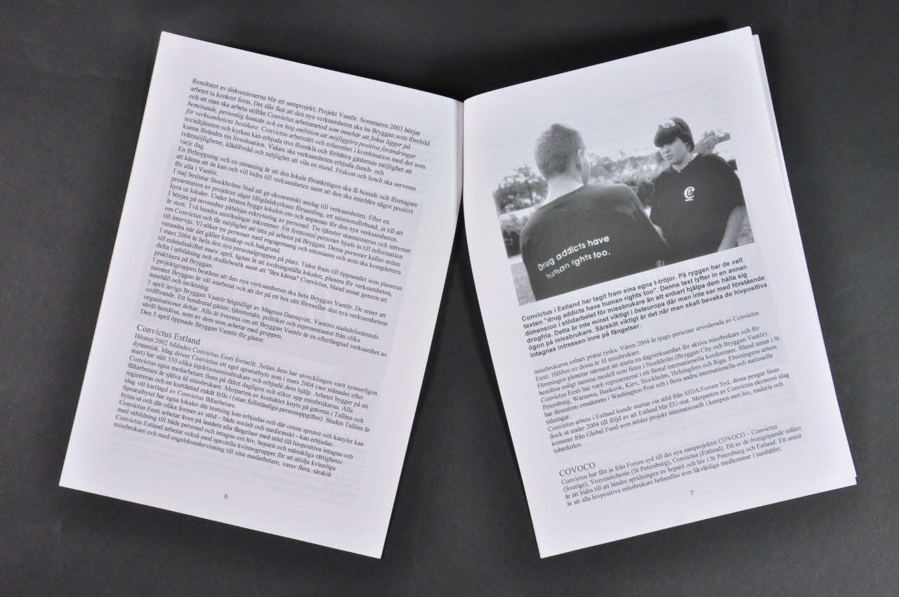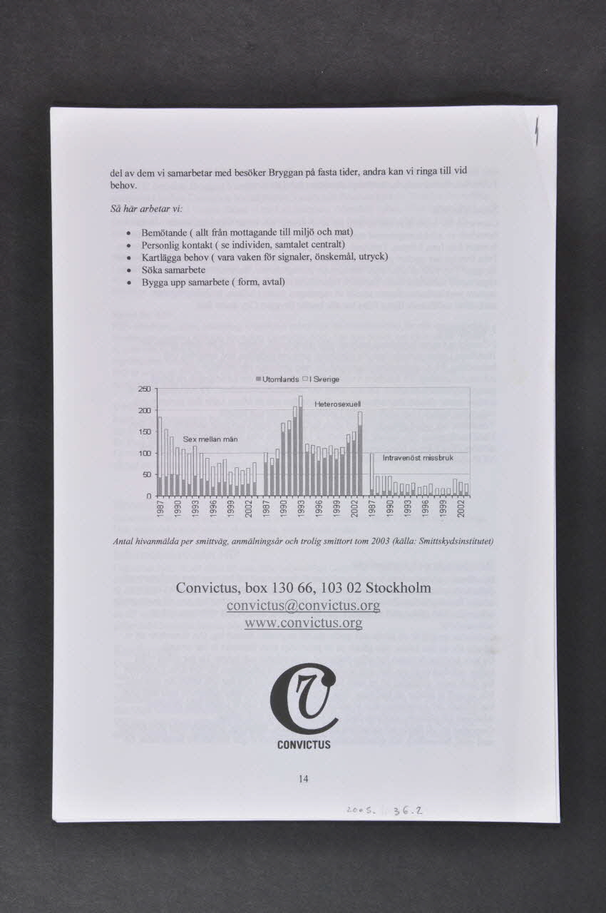 Liste des titres : - Ett är dä mycket utvecklades - HIV och intravenöst missbruk 2003 - Hivinfektion / aids - Données épidémiologiques 1987 à 2003 - Fokusmöten - Sponsringsarbetet - Bryggan City (photos) - Bryggan Vantör - Convictus Estland (Estonie) (Photo de militants en Estonie portant le tee shirt :"Drug addicts have human rights too" (Les usagers de drogues ont aussi des droits) - COVOCO Convictus Suède, St Petersbourg, Estonie - Licona (Lituanie) (photo d'une réunion en plein air) - Convictus och hiv/aidsutredningen - Living with the Daily Dose - Rekreationshuset Tomtebo - World Aids Day - Rainbow Sweden - RFHP - Samarbeten - Smittskyddsenheten - Praktikanter - 90-kontot - Uppsökande arbete - Volontärer - Hemsidan - Informationsbladet HIP - Konferenser - Studiebesök - Utbildning - Bemötande och samarbete