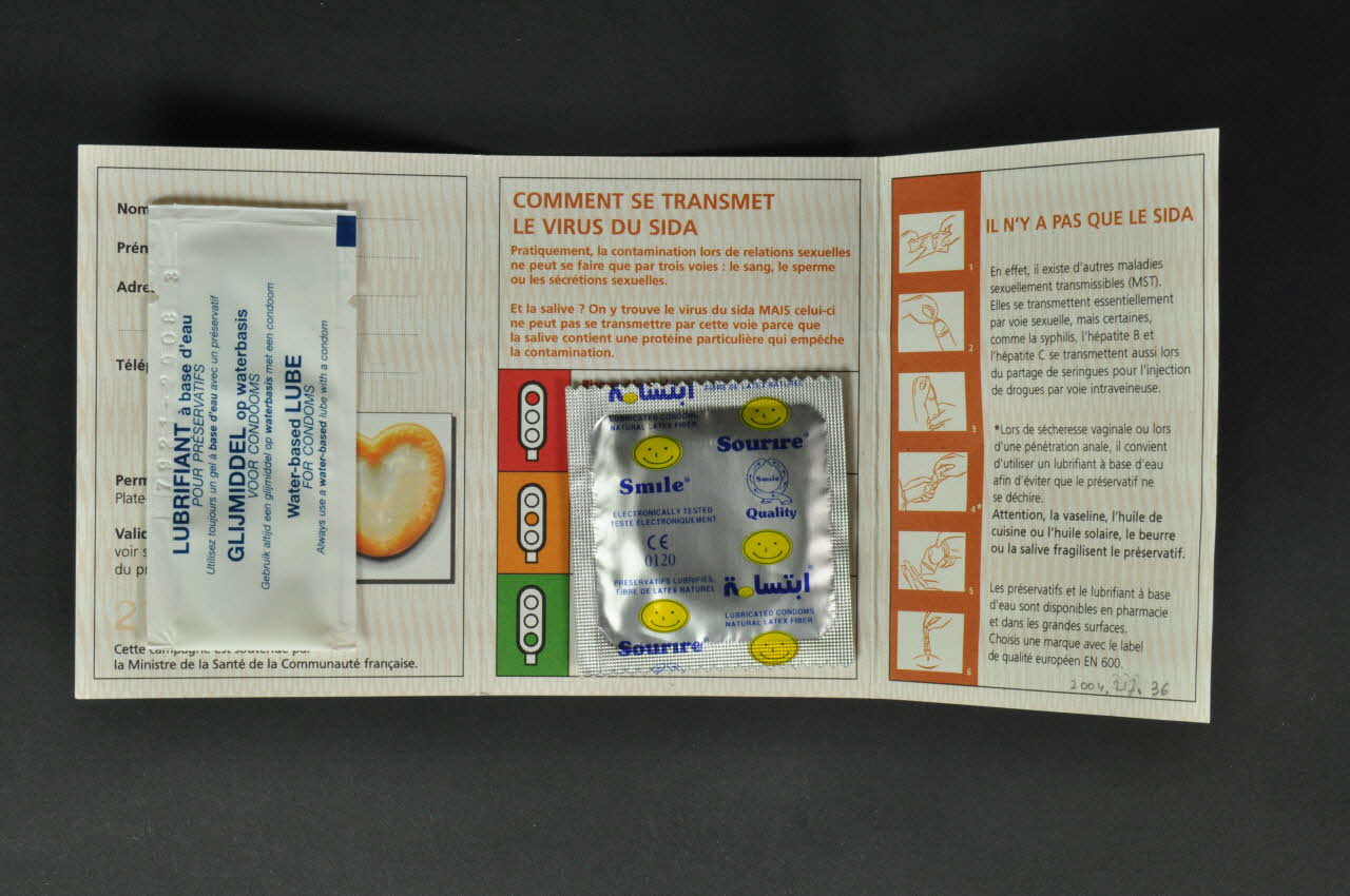 De forme rectangulaire, le dépliant en carton imite un permis de conduire par sa couleur rose, son format et sa disposition. Sur la couverture, sont imprimés des inscriptions noires et deux logos. La partie supérieure du verso est occupée par un rectangle orange contenant des inscriptions blanches. En dessous se trouvent des inscriptions noires et orange et un logo. A l'intérieur figurent des inscriptions noires et orange accompagnées d'illustrations : un préservatif en forme de coeur, des feux de circulation et six schémas expliquant l'utilisation d'un préservatif. Sur le premier feuillet est collé un sachet de lubrifiant et sur le deuxième feuillet un préservatif emballé. Le sachet de lubrifiant est rectangulaire, en plastique blanc, aux bords thermo-collé et présentant des inscriptions bleues. Le préservatif est emballé dans une enveloppe carrée en matière plastique argentée, aux bords thermo-collés. Y figurent des inscriptions bleues accompagnées de smileys.Inscriptions
