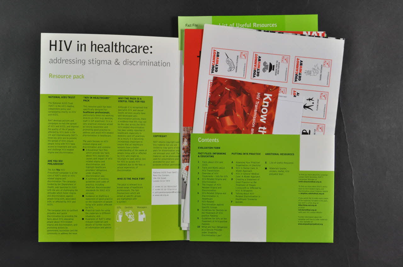 Sur les intérieurs de couverture : présentation : de l'association / de la campagne :"are you HIV prejudiced ?", du "package" et à qui il s'adresse (médecins généralistes, dentistes, personnel administratif et de gestion) / Sommaire.