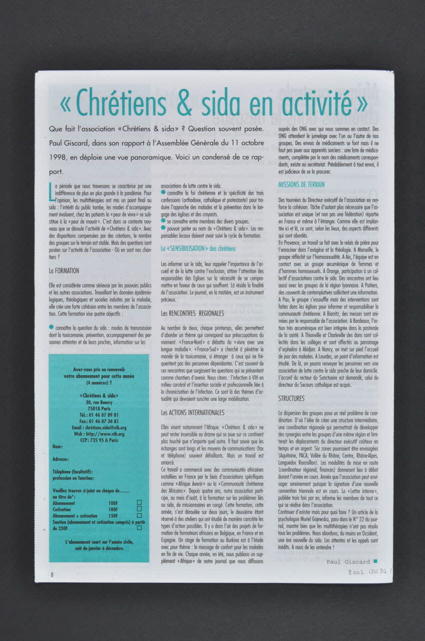 "Chrétiens & sida" // 30 rue Boucry // 75018 Paris (à gauche de la dernière page, sur un bandeau vert), en basDécor