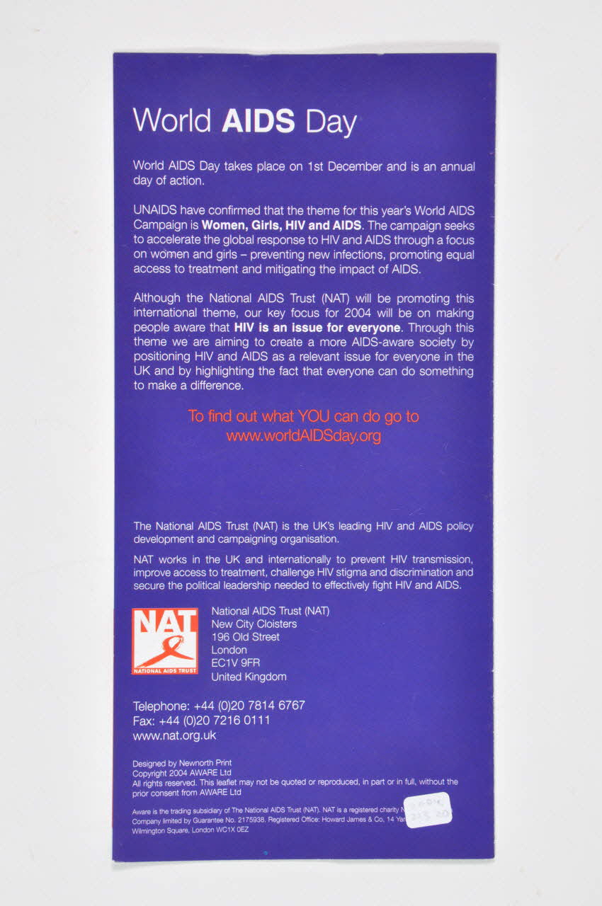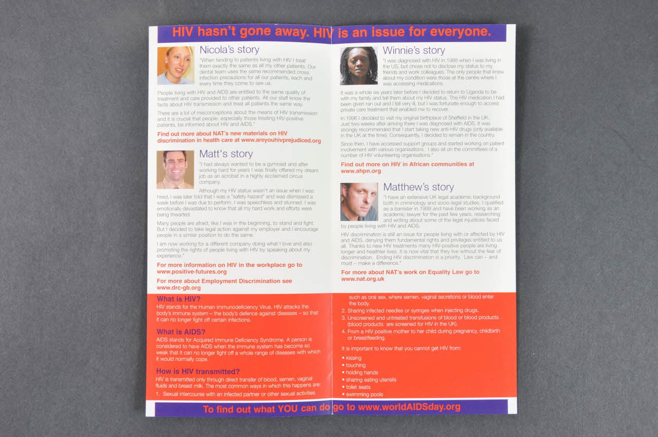 A l'intérieur, un petit bandeau bleu se trouve en haut et en bas des deux feuillets avec une inscription en rouge. Au centre, figurent quatre paragraphes inscrits en bleu, noir et rouge sur fond blanc. Il s'agit de quatre histoires : une dentiste qui traite de la même façon tous ses patients, un acrobate qui a été renvoyé de son travail à cause de son statut, une femme noire qui est traitée au Royaume Uni et reçoit un soutien de sa communauté, un juriste qui lutte contre les discriminations. Une photographie couleur format carré de la personne qui relate son histoire est présente au début de chaque paragraphe. En dessous figure un large bandeau rouge avec une inscription en bleu foncé et en blanc.