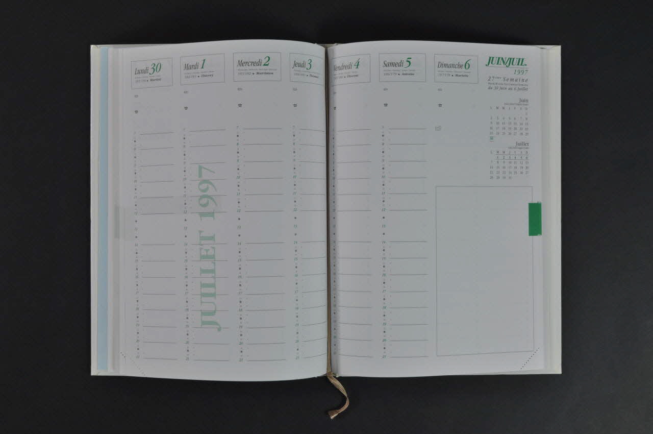 Agenda 1997 distribué et vendu par l'association "Dessine moi un mouton". Couverture en carton plastifié rigide blanc avec logo de l'association en vert sur ruban rouge. Cadre vert englobant l'ensemble de la couverture (face et dos). Inscription "Agenda 1997" en bordure inférieure.Au dos, sur la moitié inférieure, cadre avec logo de l'association.