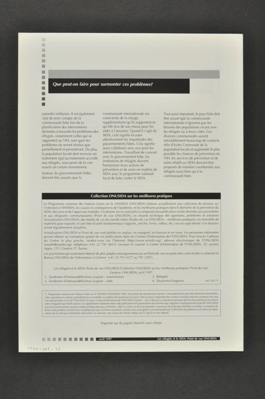 - Que peut-on faire pour surmonter ces problèmes ? : Garantir un approvisionnement en sang sûr / Approvisionnement de fournitures pour les "précautions médicales universelles" / Distribution de préservatifs / Accès à l'information de base sur le VIH/sida / Protection physique des réfugiés / Usage de drogue par injection - la stratégie du moindre mal / Accès aux services de santé / Soins complets pour les personnes infectées par le VIH et malades du sida / matériel scolaire, campagnes d'information et planification / Plaidoyer et communication : rassurer la communauté et le pays d'accueil